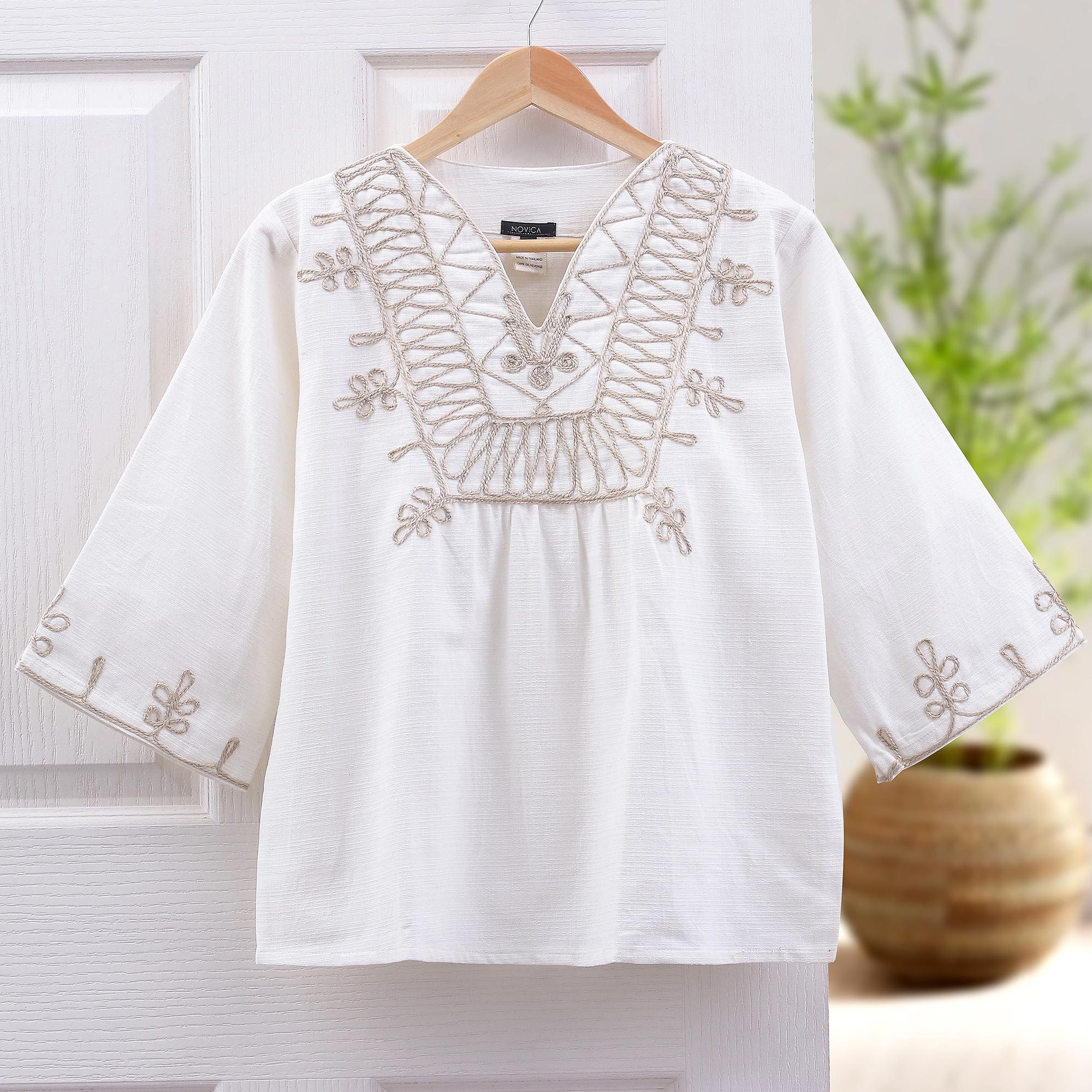 A dance of elegant artistry decorates this cotton blouse by Jariya Kakaew. The blouse is trimmed with ornate patterns that are hand-embroidered with twine.