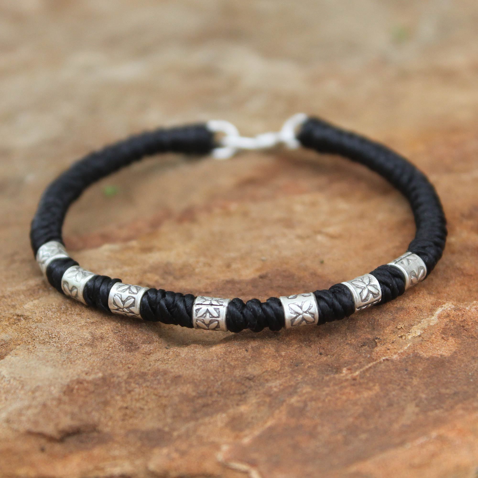 Napapat designs a modern braided bracelet with techniques that the Yao women normally only teach their daughters. She decorates it with florid sterling silver beads featuring an oxidized finished, done by Karen hill tribe silversmiths.