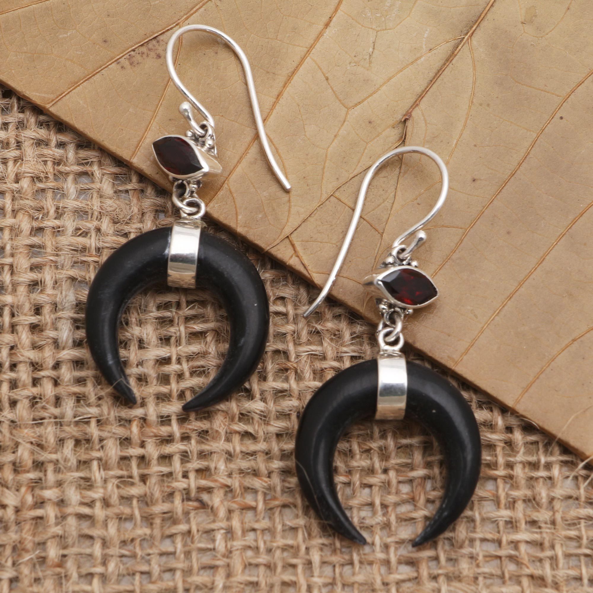 Bali's Made Wardika hand carves a sleek black crescent moon from horn to create these mysterious dangle earrings. The artisan uses a faceted garnet gem to add a pop of bright red to earrings, while sterling silver accents and hooks finish the unique pair.