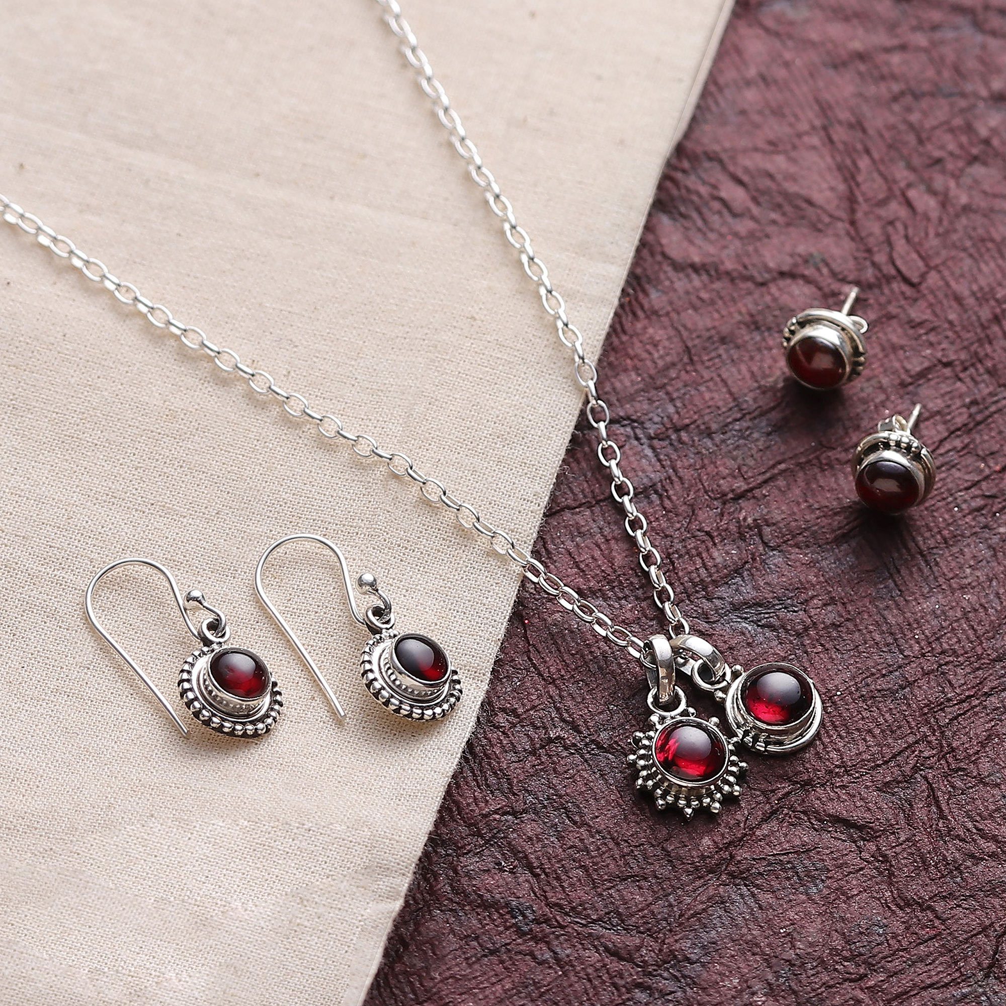 Coordinate your outfit with ease wearing this done-for-you set of matching jewelry designed by Indian artisan Bhavya Jain. Hand crafted with garnet gemstones, the set includes a necklace with two round pendants, a pair of stud earrings, and a pair of dangle earrings designed with round gemstones. The entire set is crafted from 925 sterling silver that complements the gemstones perfectly. An embroidered felt patch accompanies the set for safe keeping.