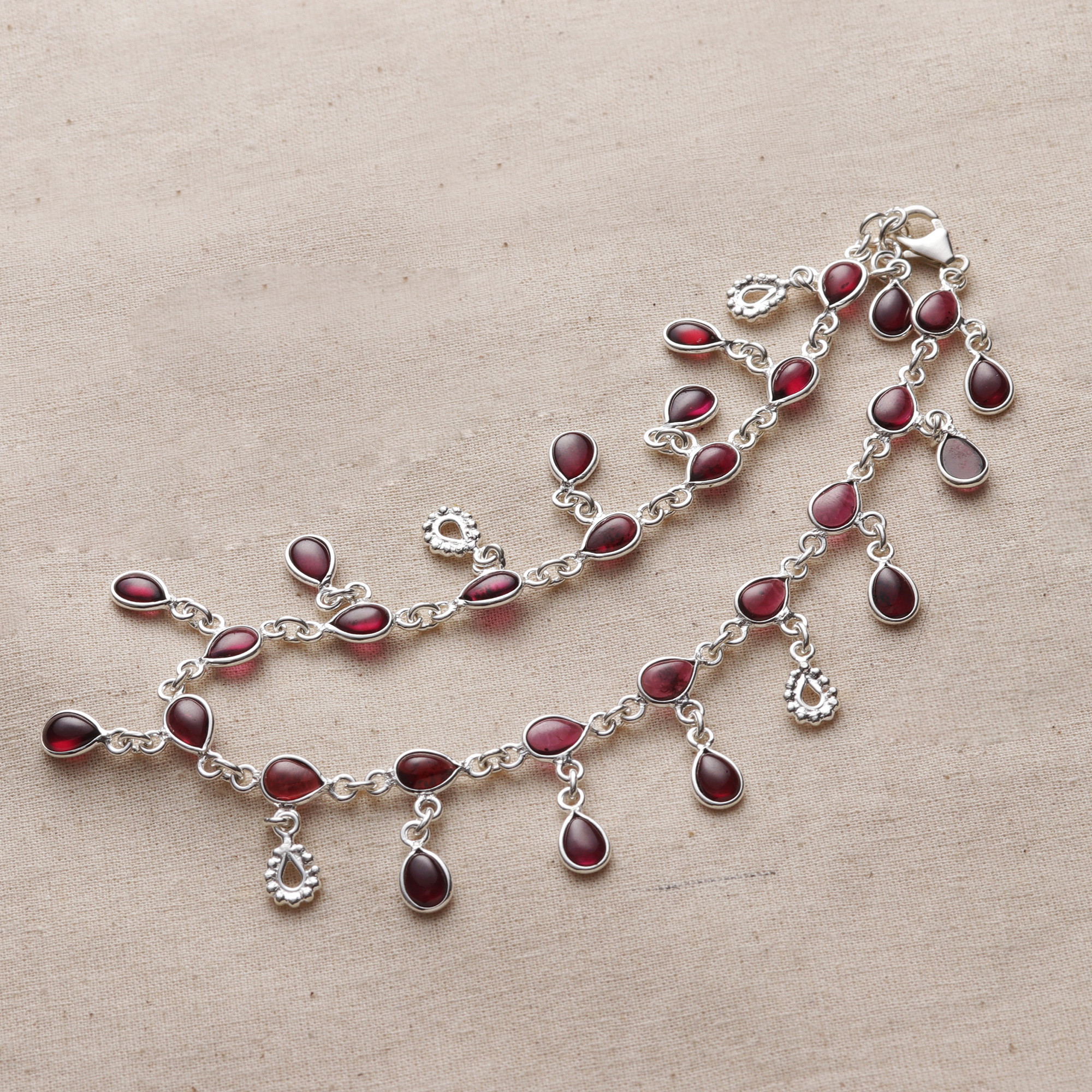 A beautiful, dainty accessory for the worldly woman, this anklet from India features 26 garnet charms that sparkle with deep red hues. Presented by Neeru Goel, the anklet is handcrafted from sterling silver by local Indian artisans.