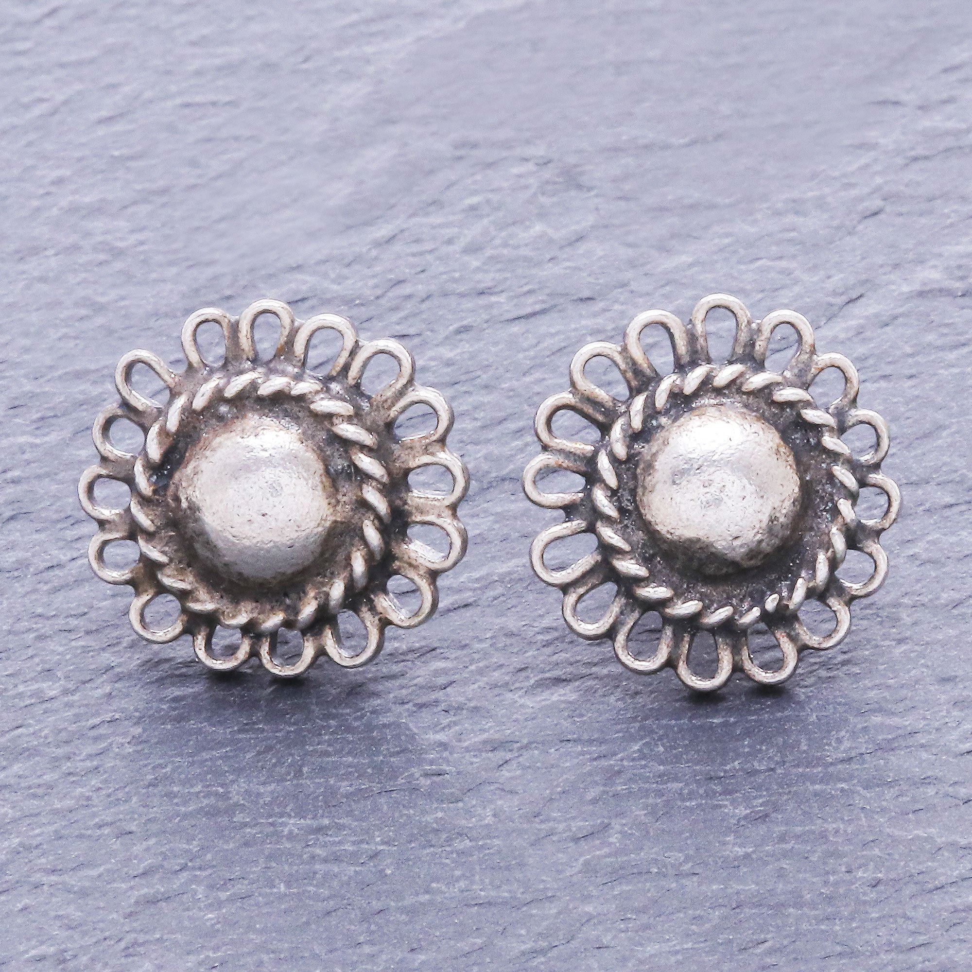 Hand Made Karen Silver Sunflower Button Earrings, 'Sunflower Loops'