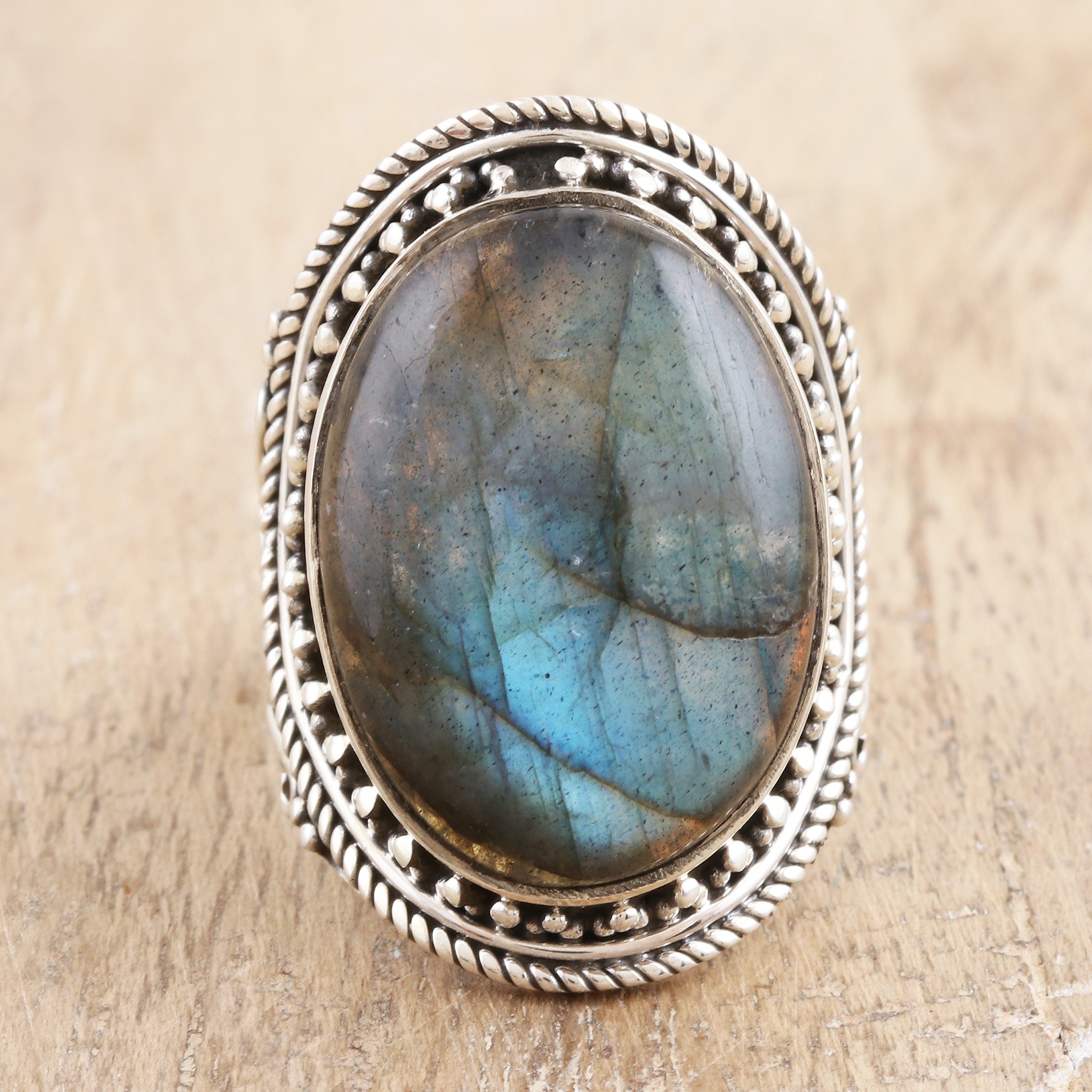 A large, iridescent labradorite gemstone shimmers at the center of this stunning cocktail ring. Hand crafted by India's Rakesh Rana, the ring features a sterling silver band adorned with intricate sterling silver details.
