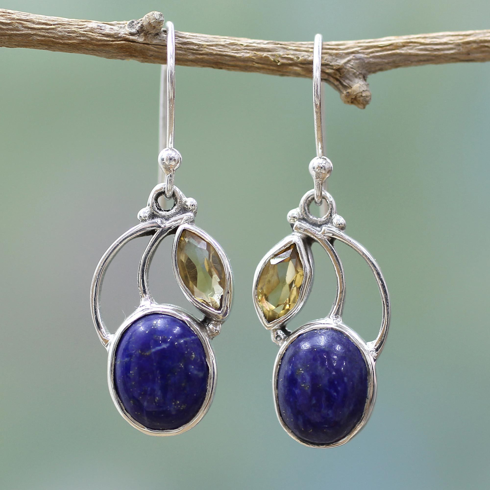 Hand Made Lapis Lazuli Citrine Dangle Earrings India, 'Starry Beauties'