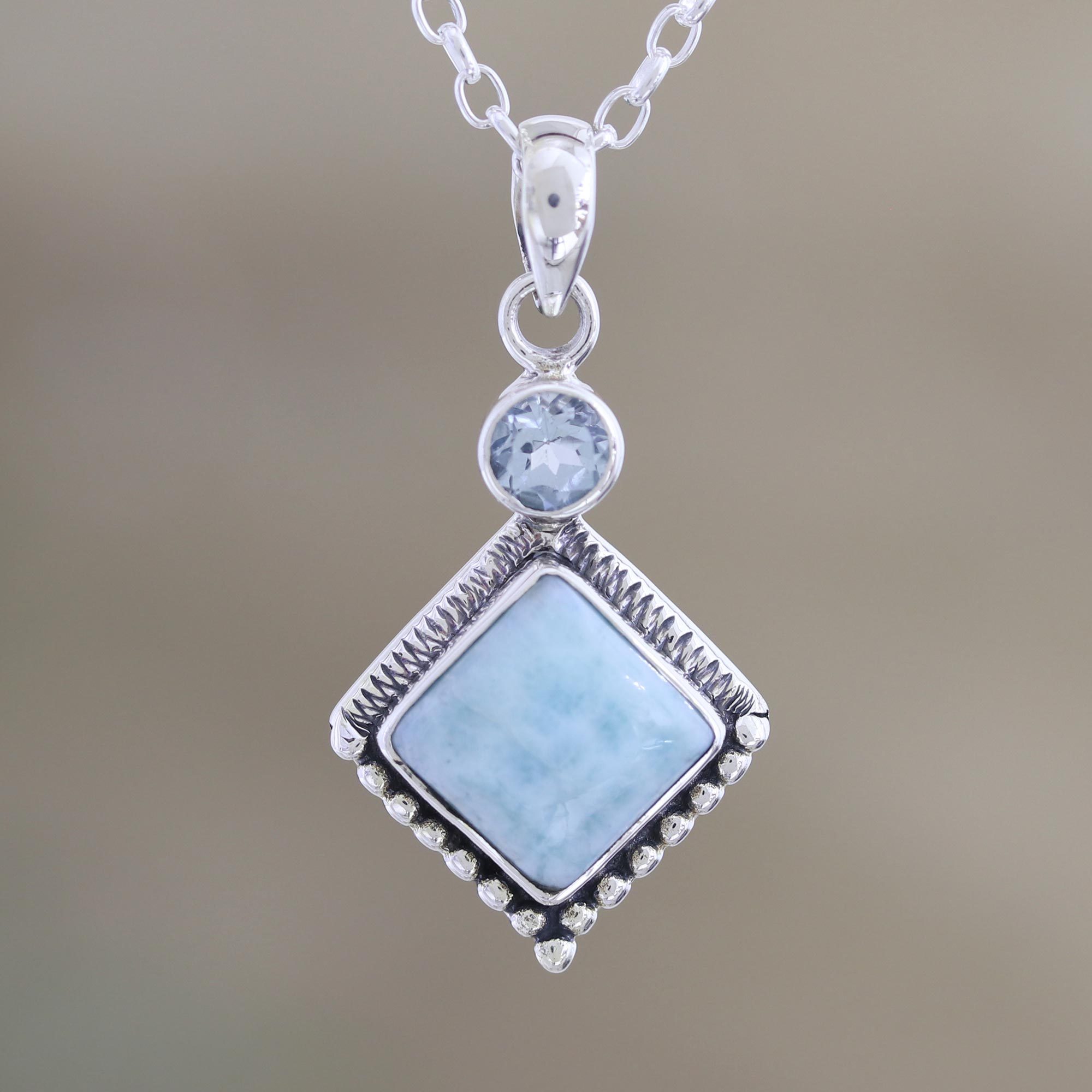 Presented by Neeru Goel, this sky blue pendant necklace is a breath of fresh air. To create the pendant, Indian artisans stack a sparkling blue topaz gem on top of a cloudy larimar stone. Suspended from a sterling silver cable chain, the pendant radiates serene optimism.