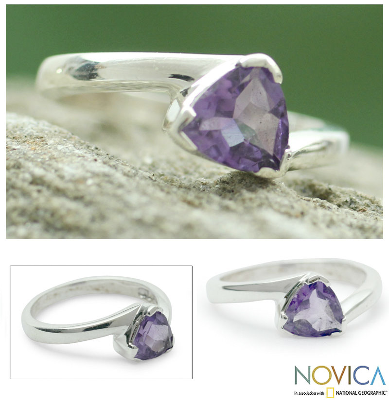 Sparkling amethyst crowns this solitaire ring from India's Alok Jain. The 1.5 carat faceted gem is regarded as the stone of spiritual wisdom. The ring is crafted of sterling silver featuring a smooth and polished finish.