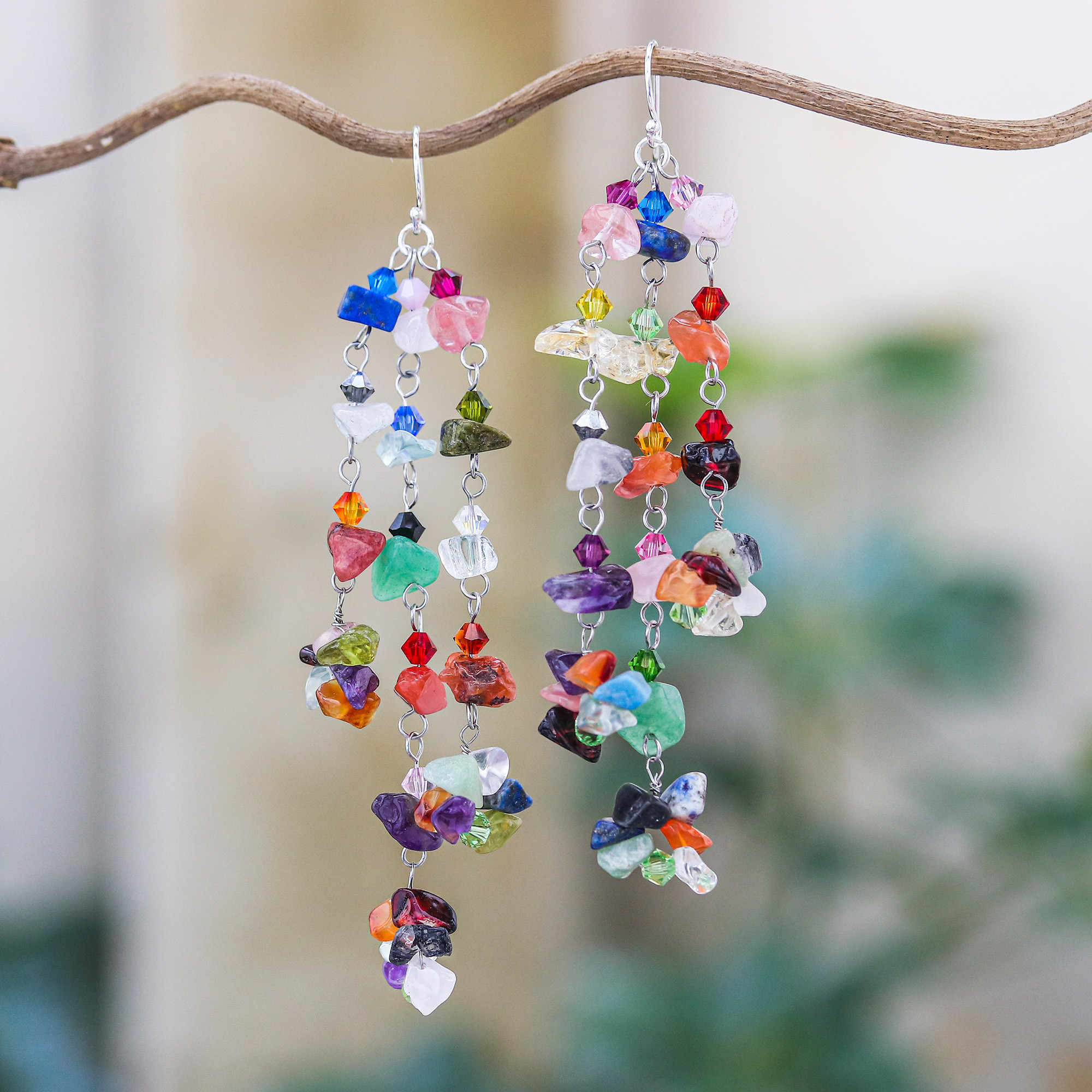 Hand Made Multigem Earrings, 'Rainbow Rain'