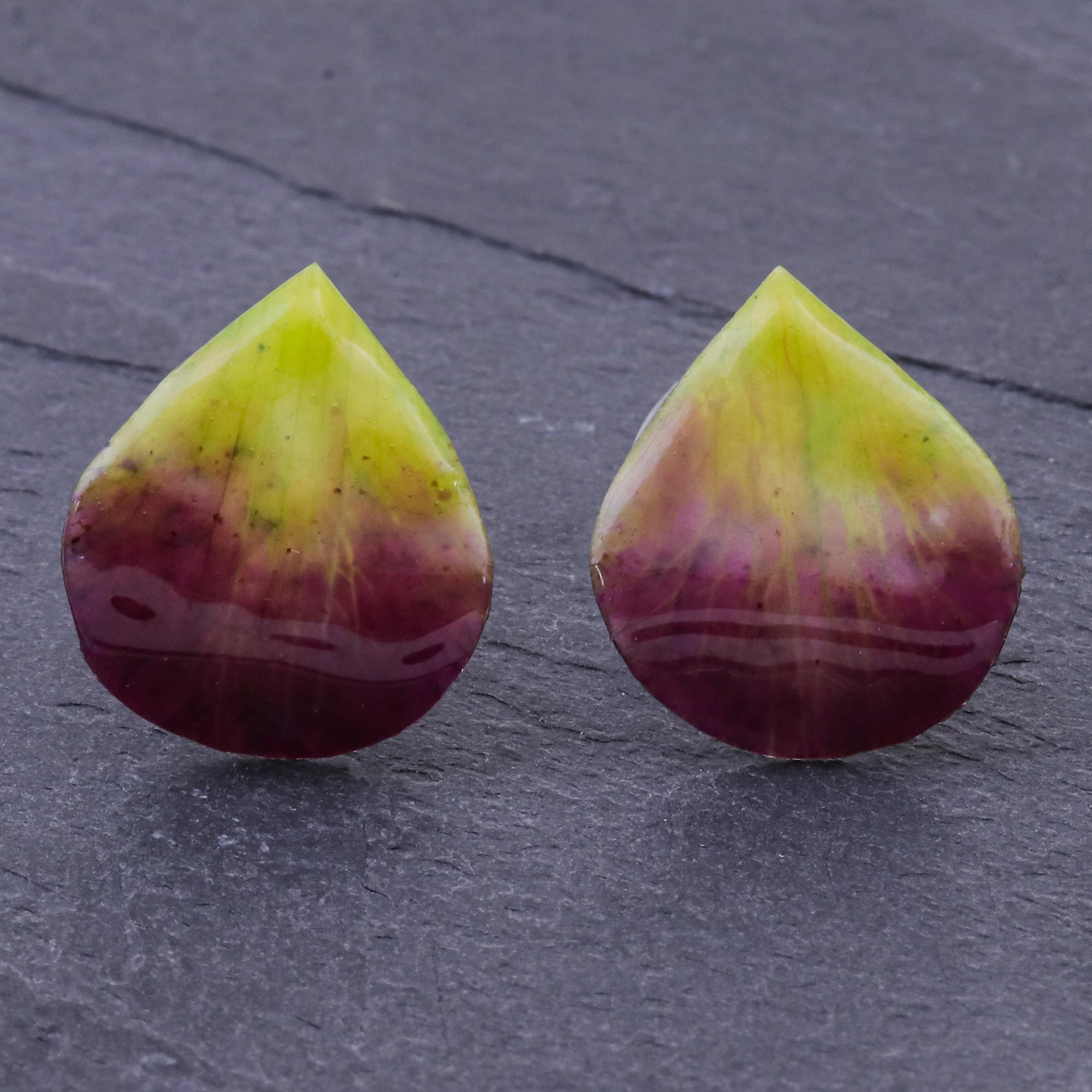 Crafted from genuine orchid petals, these button earrings presented by Thailand artisan Danai catch the eye with their unique drop shape and rich color. The radiant green and purple petals are coated with a glossy resin, then finished with a stainless steel post back. The size and the shape of the orchid petal may vary from season to season.