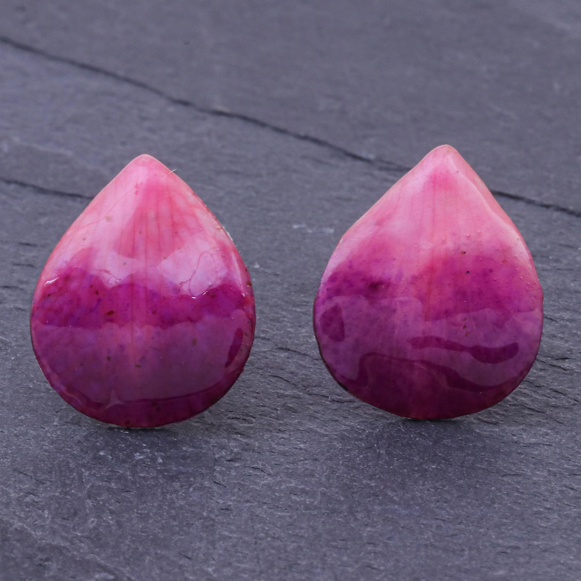 Crafted from genuine orchid petals, these button earrings presented by Thailand artisan Danai catch the eye with their unique drop shape rich color. The radiant fuchsia petals are coated with a glossy resin, then finished with a stainless steel post back. The size and the shape of the orchid petal may vary from season to season.