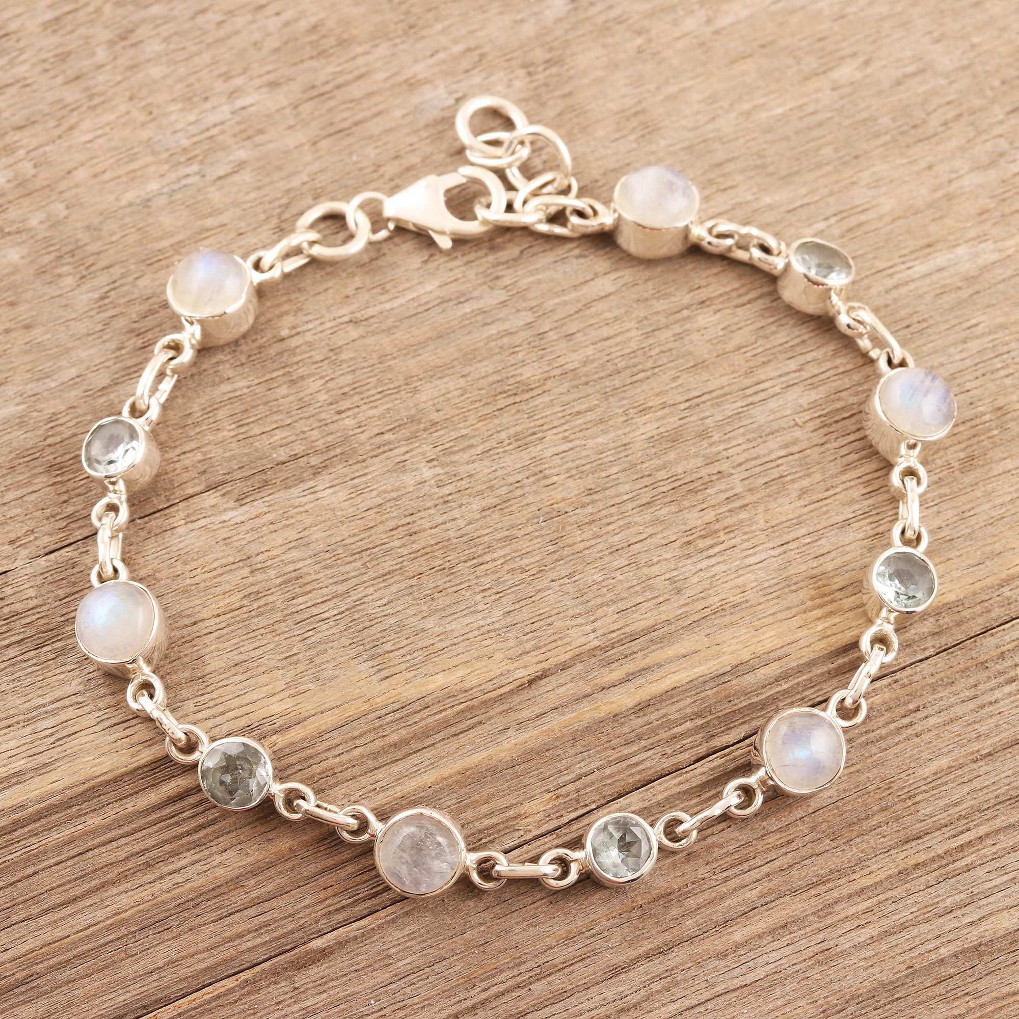 Add a touch of understated elegance to your outfit with this ravishing link bracelet from India's Shanker. Linked by shining sterling silver, six rainbow moonstone globes alternate with five faceted blue topaz gemstones in bezel settings. The bracelet fastens with an adjustable lobster claw clasp in sterling silver.