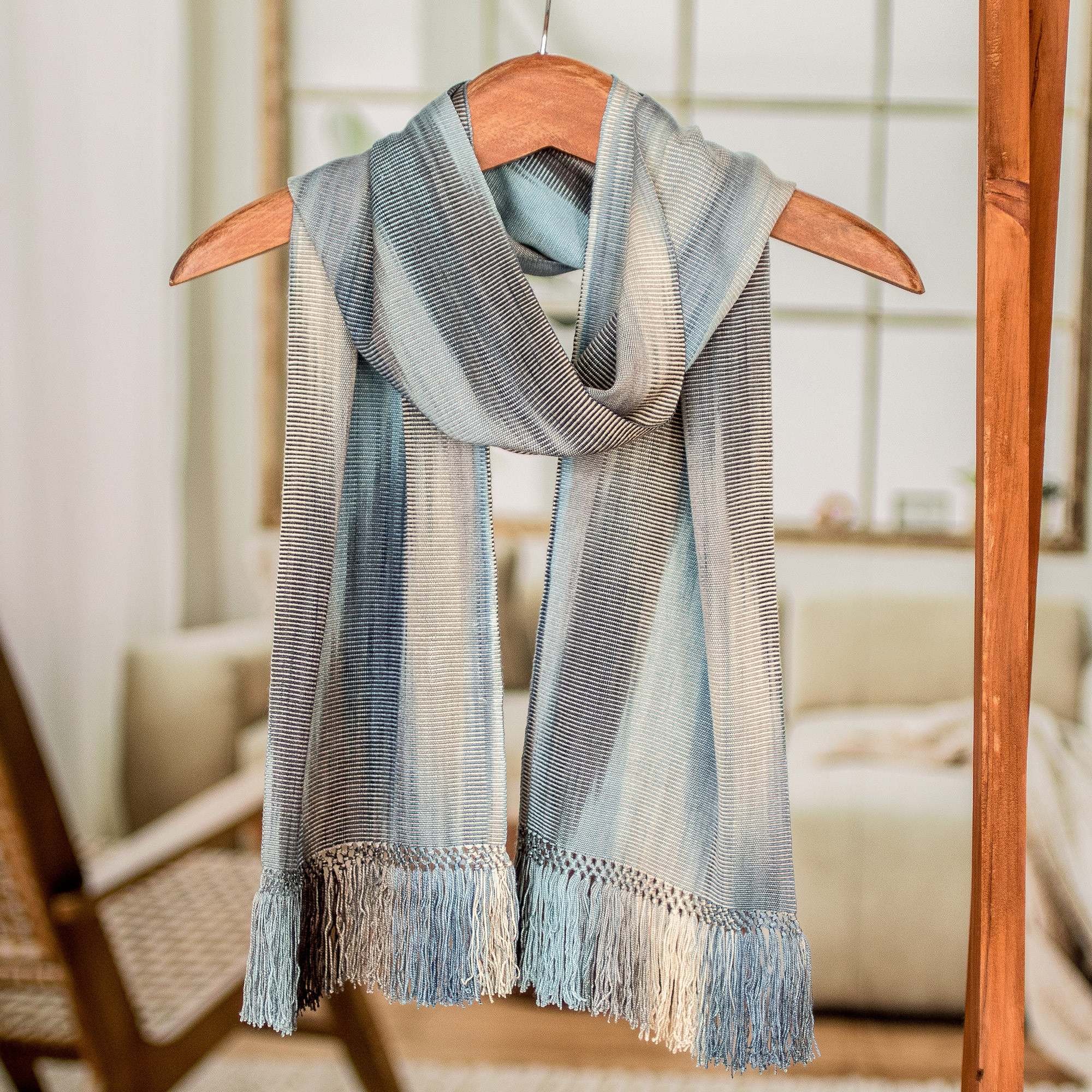 Talented weavers from K'amolon K'i K'ojonel create an admirable iridescent effect as they weave this scarf on a traditional backstrap loom. Working with rayon made from bamboo fiber, they weave this scarf in shades of light blue, turquoise, cream, green and splashes of black.