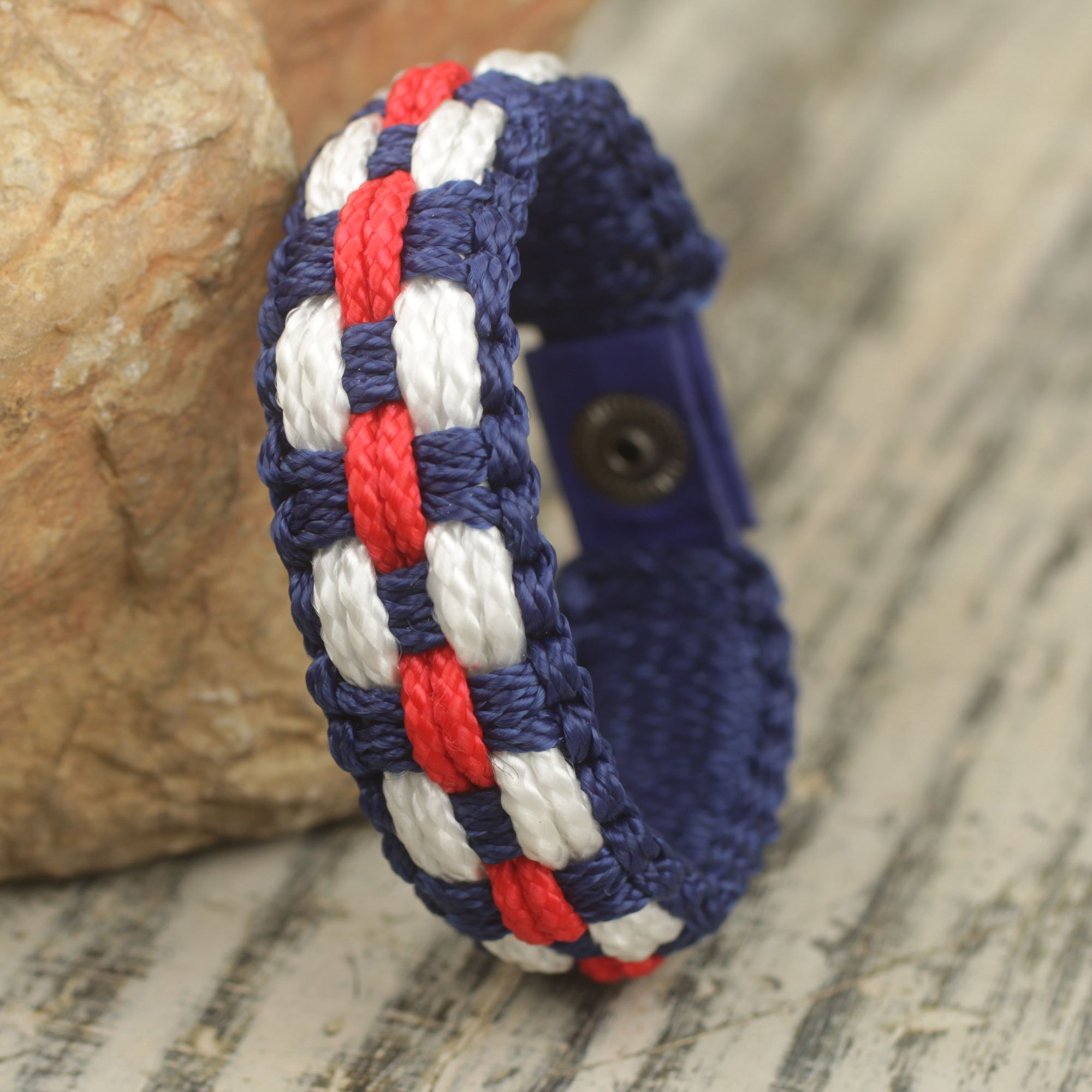 Ghana's Robert Aidoo-Taylor crafts a colorful wristband bracelet for men, hand-woven from sturdy polypropylene cords. The scarlet, blue and white bracelet closes with a brass snap.