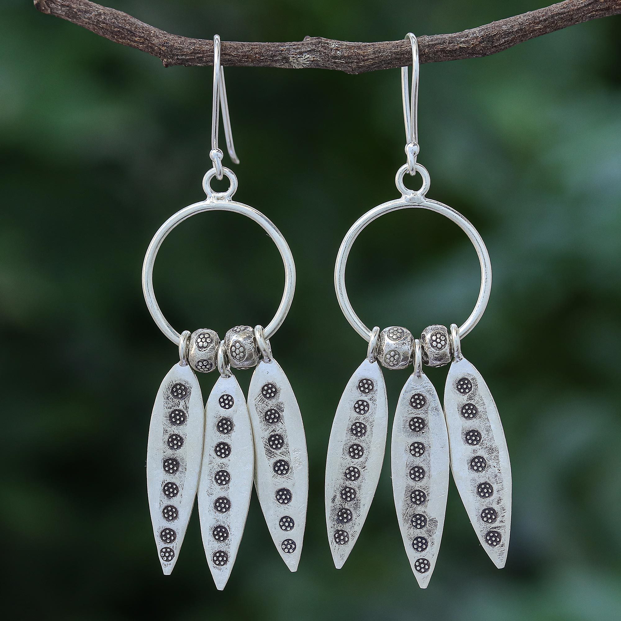 Celebrate your love of flowers and nature wearing these lovely dangle earrings from Thailand's Pakaon Sojintarit. Three flower-stamped charms dangle from a sterling silver hoop, while two 950 Karen silver rondelle beads make welcome additions.