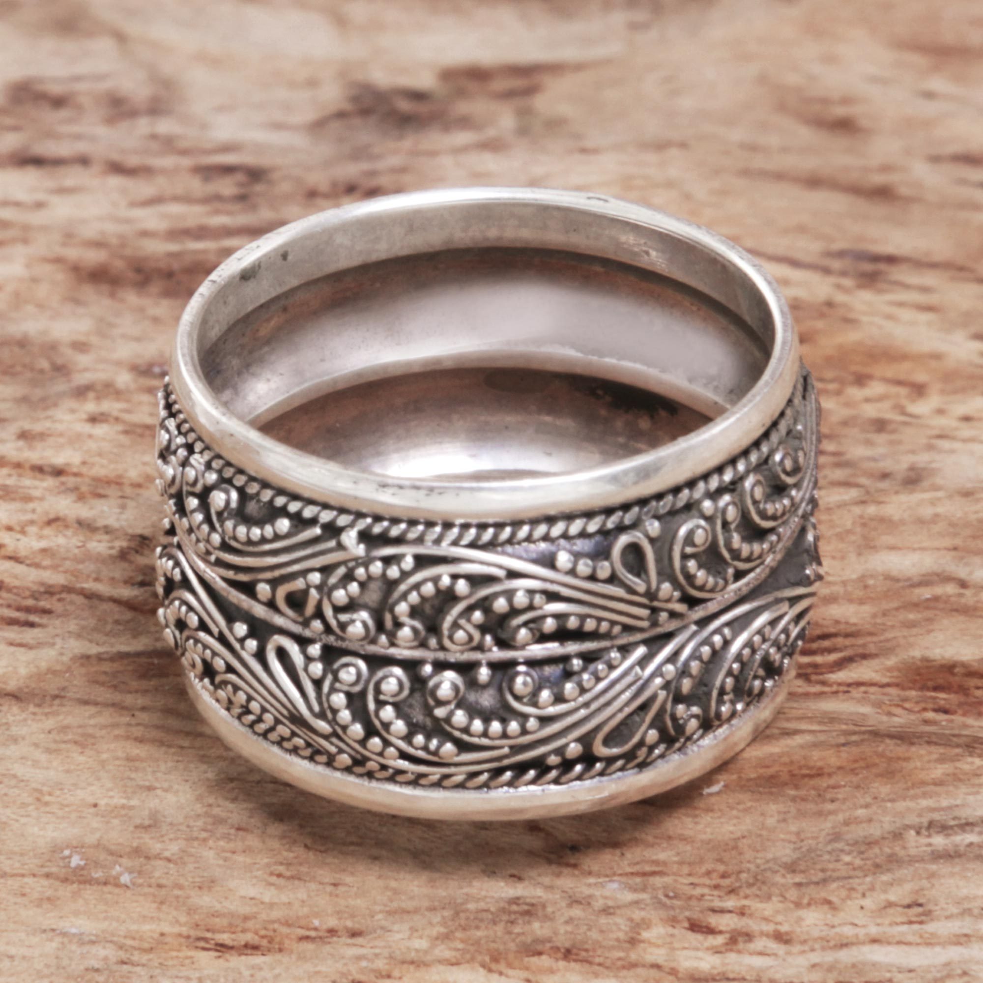 This wide band ring is handcrafted from sterling silver, with swirling Balinese motifs that capture the beauty of an Indonesian forest. Made Sudiari designs it, working alongside her family to create beautiful pieces of jewelry like this ring.