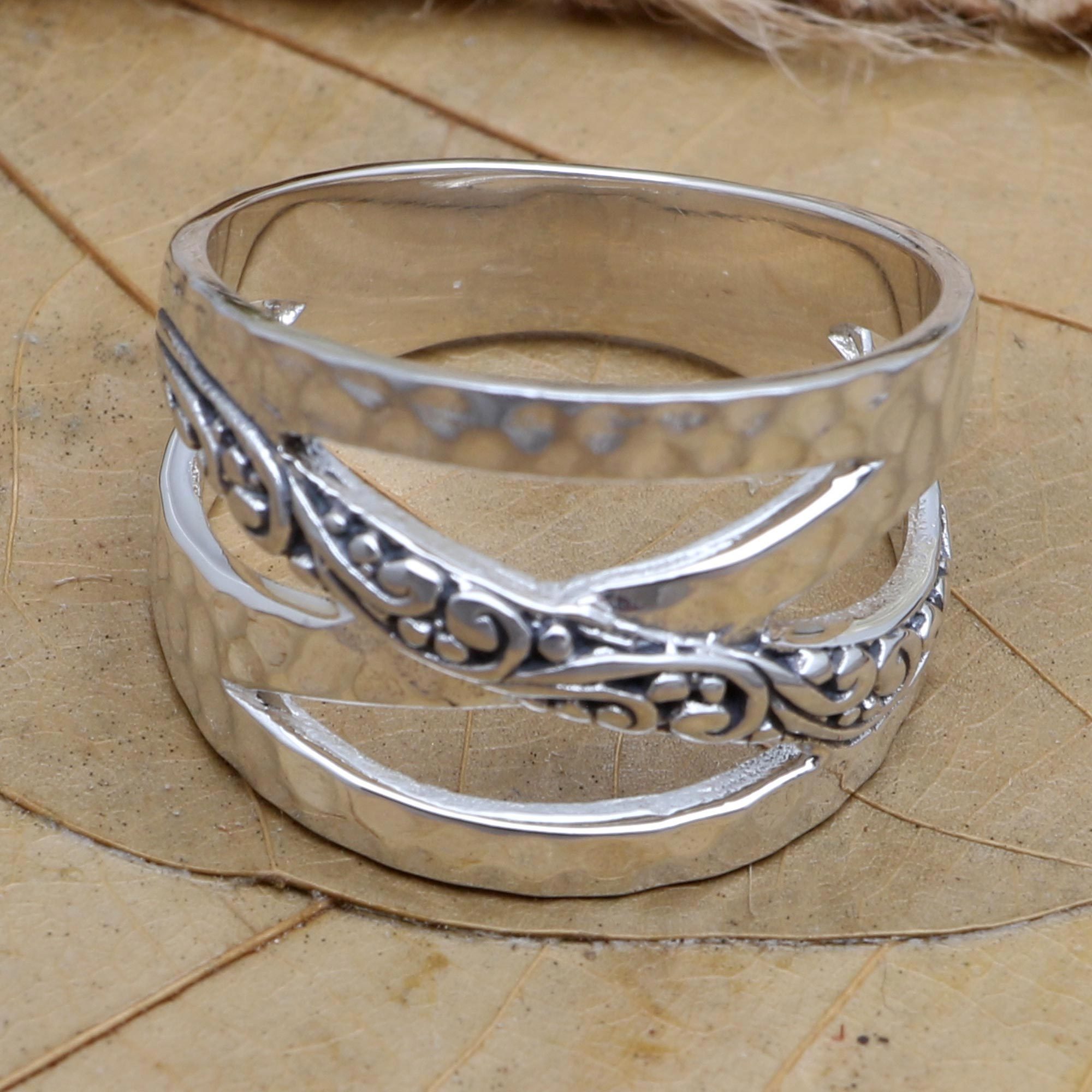 Intercepting lines of silver wrap your finger in simple elegance. Crafted by Bali's Ari Gunawan from sterling silver, the thick band ring features a hammered finish and a crisscrossing Balinese design the artisan treats with an oxidized finish.
