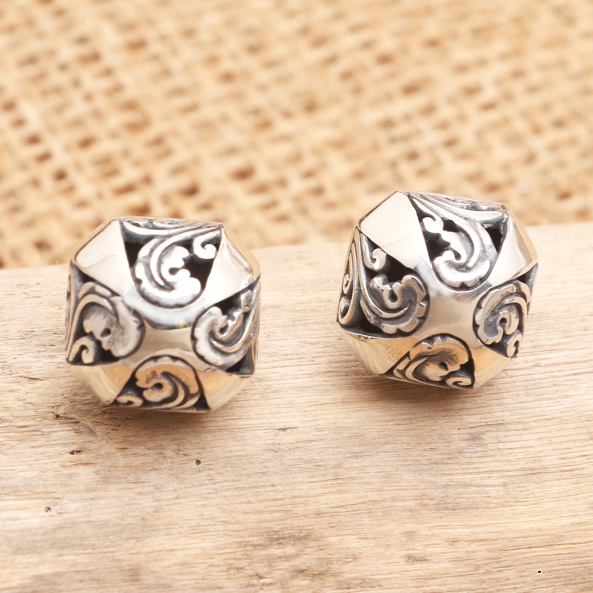 Using traditional Balinese designs, artisan Dewa Arimbawa creates a pair of elegant earrings, perfect for an evening out. Crafted from sterling silver, the button earrings feature a swirling openwork design and a shining, polished finish.