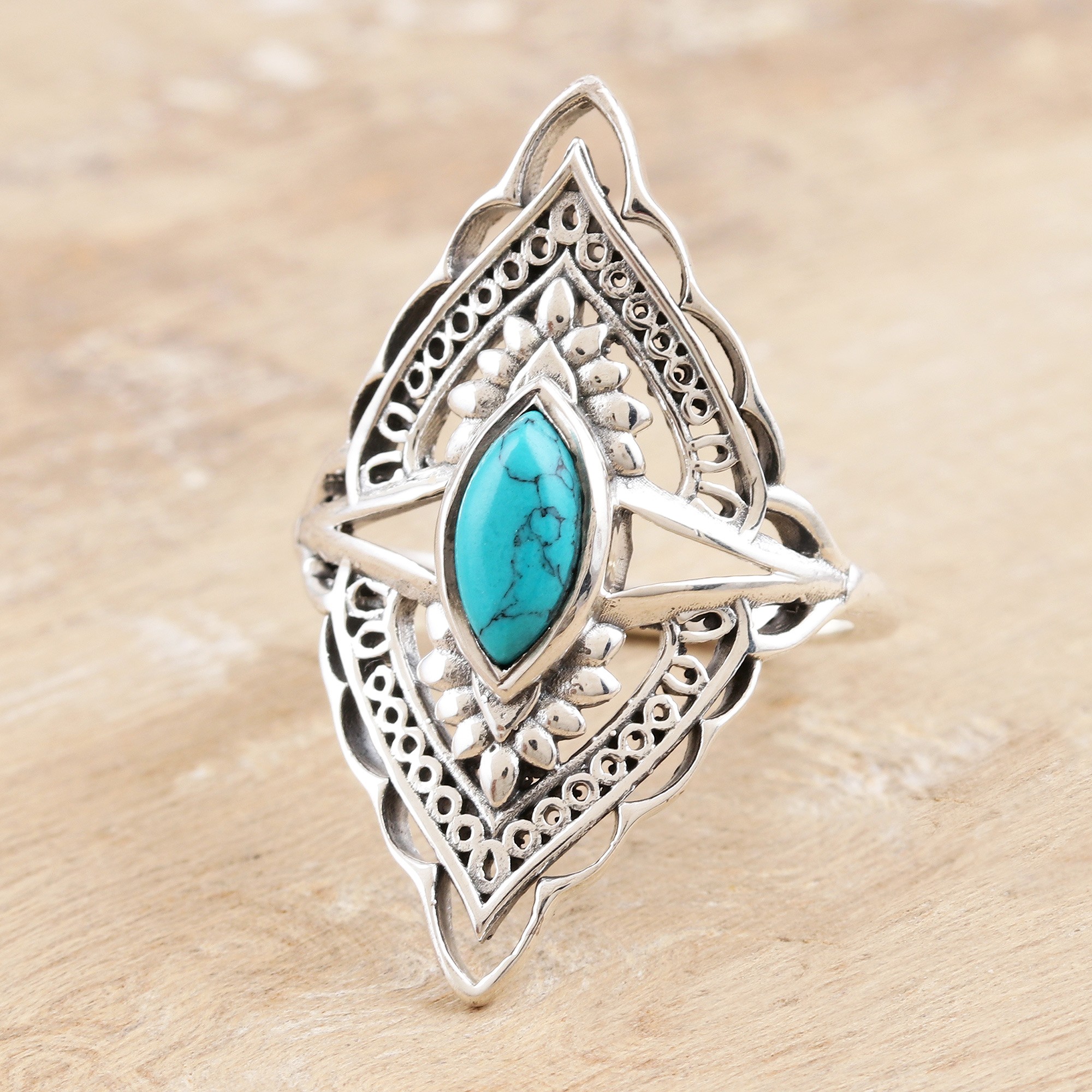 Designed by Shivani Choudhary, this majestic cocktail ring is meant to take your breathe away. Indian artisans center the ring with a reconstituted turquoise gem in a bezel setting, carefully handcrafting an openwork frame from sterling silver that complements the gem perfectly.