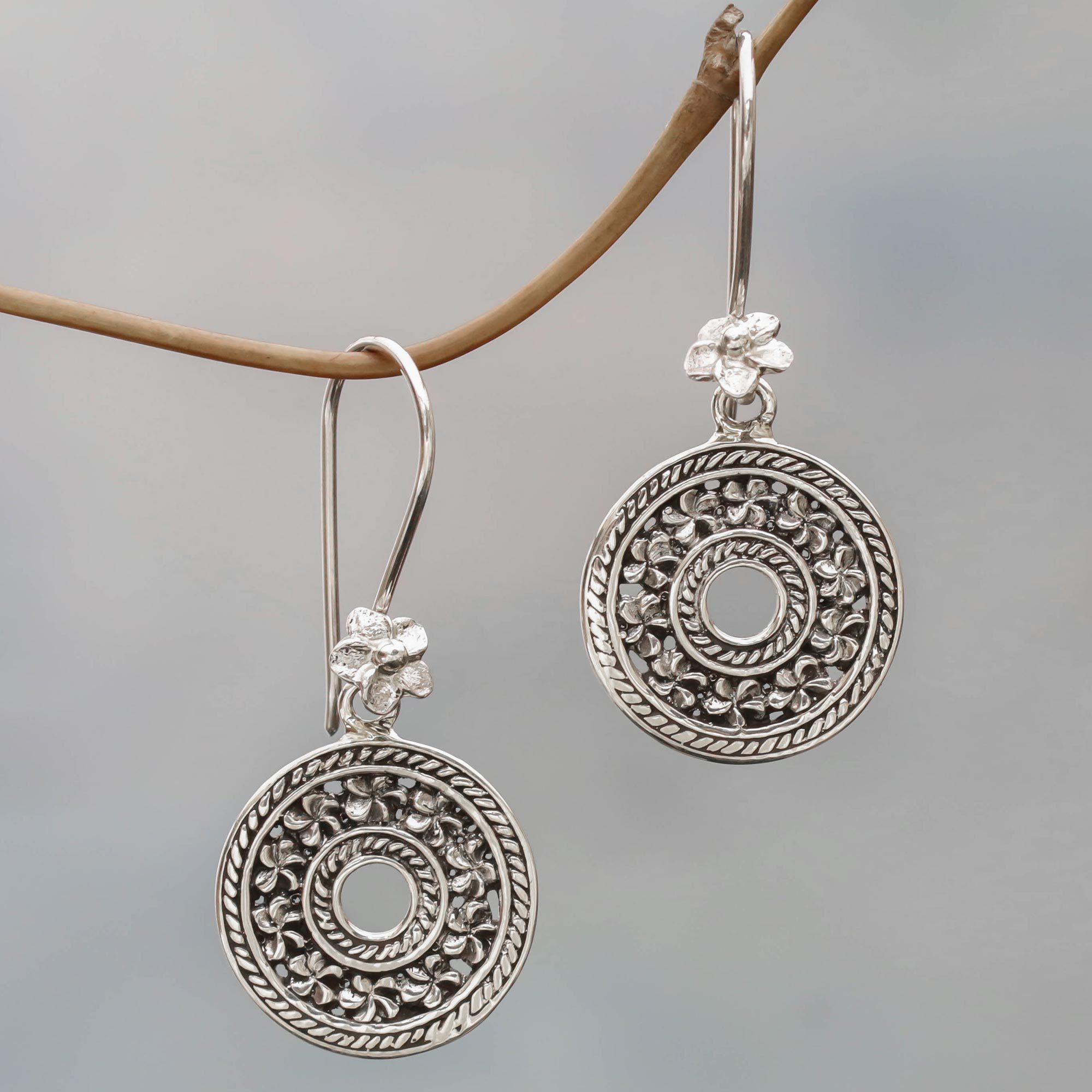 Handcrafted from sterling silver in circular shapes and adorned with floral motifs, this pair of Indonesian dangle earrings is designed by Buana, who has been exposed to local crafts from a young age. The designs present in these are inspired by the beautiful jepun flower or frangipani.