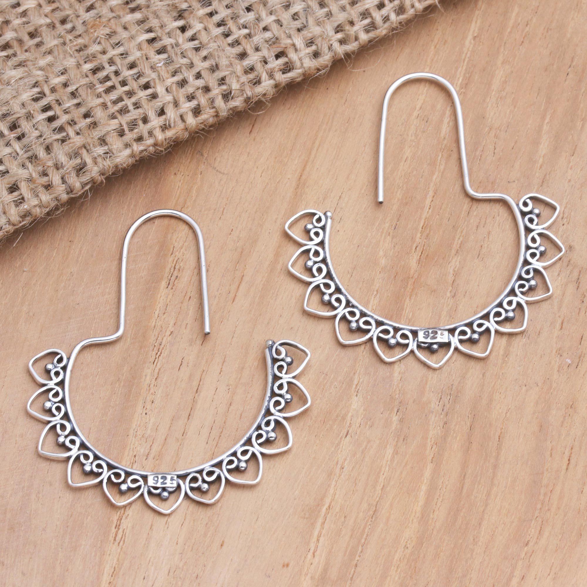 Designed to swoop under your ears, Ketut Adimasta's drop earrings are an elegant display of Balinese craftsmanship. The artisan uses sterling silver to create the earrings, hand crafting traditional Balinese designs along the edges for an opulent appearance.