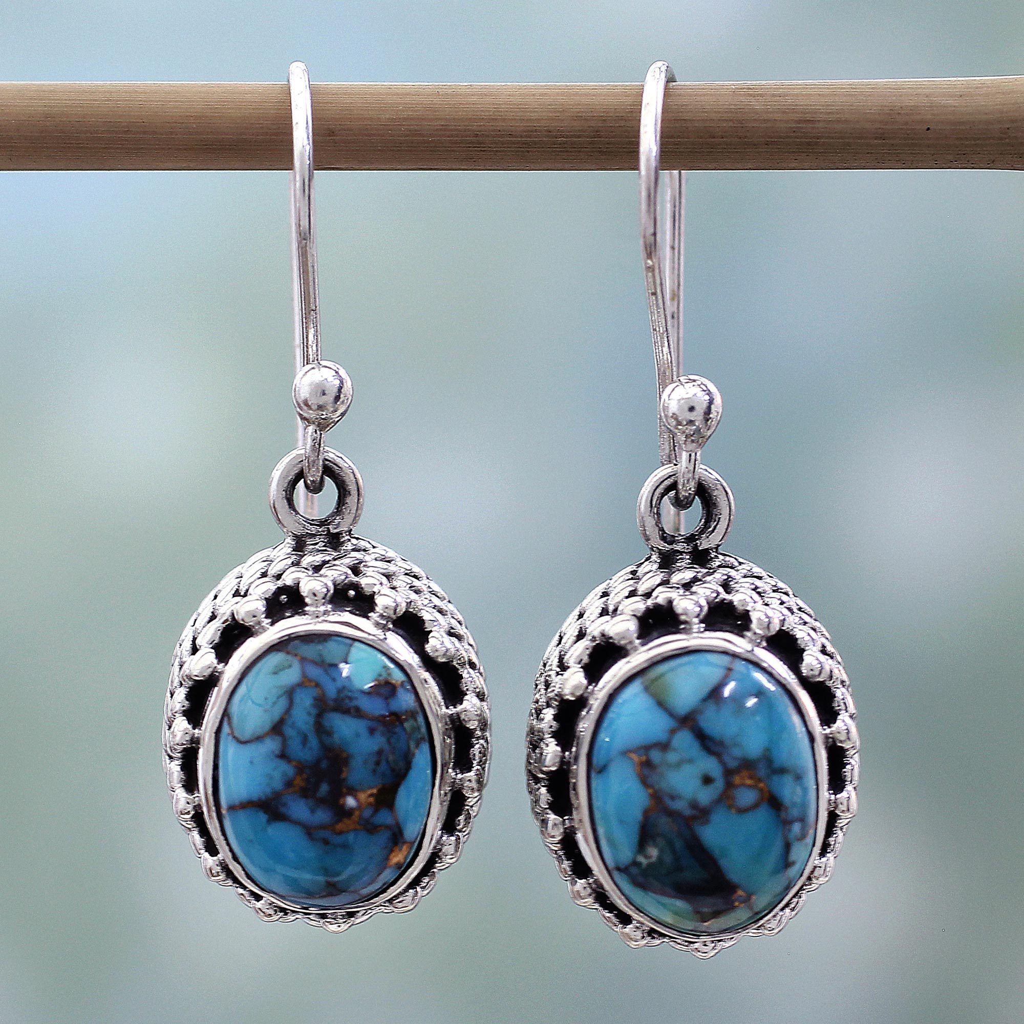 These sterling silver dangle earrings are presented by Indian artisan Shanker. Featuring stones of blue composite turquoise, this handcrafted pair hangs from silver hooks.