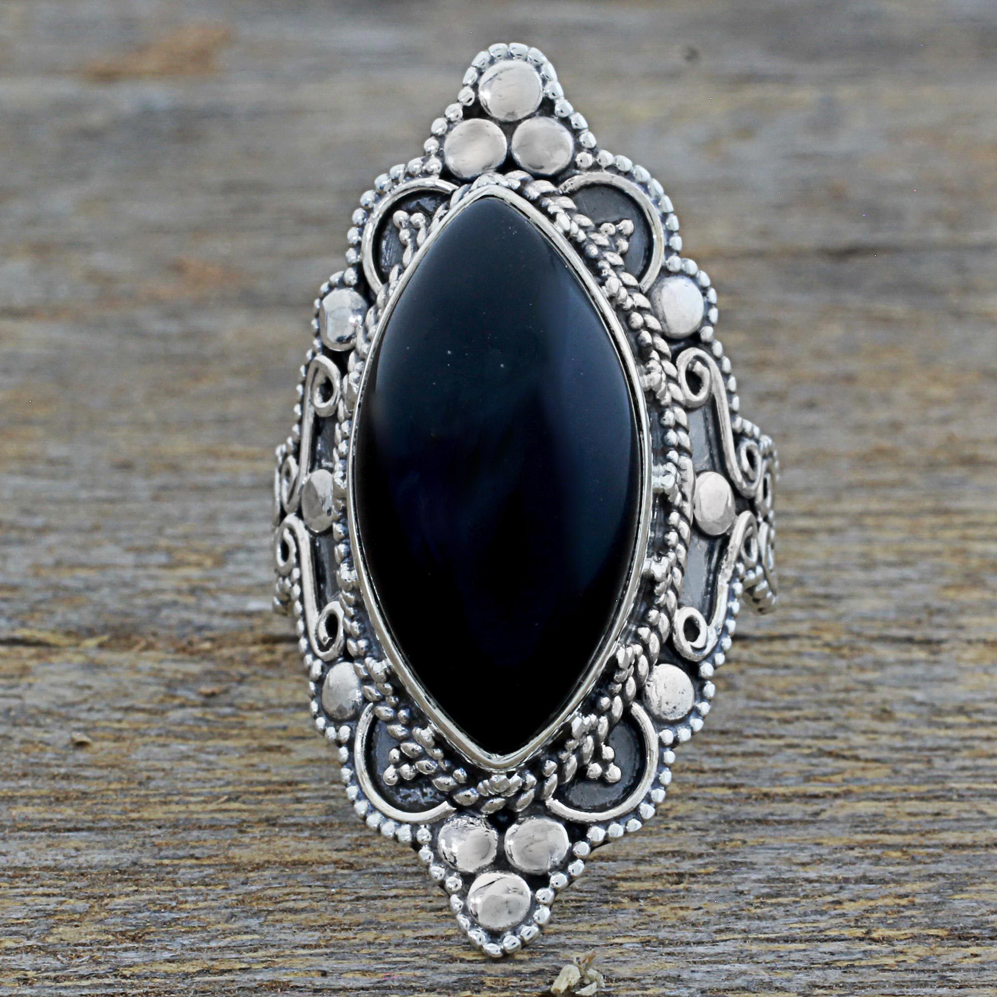 Hand Made Sterling Silver Onyx Cocktail Ring from India, 'Midnight Grandeur'