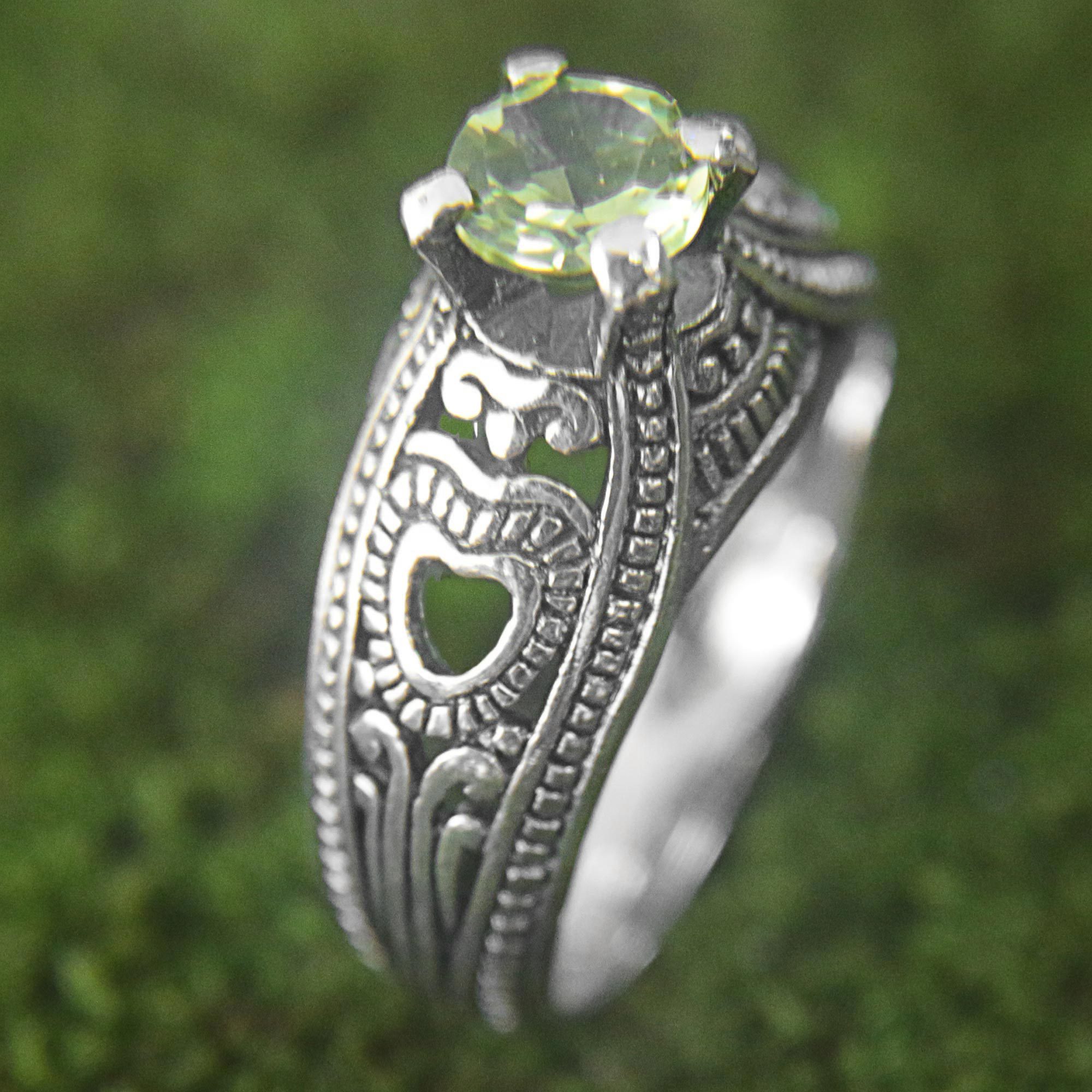 A single faceted peridot twinkles in bright spring green atop this solitaire ring, with a handcrafted sterling silver band with openwork heart motifs. Indonesia's Agung Jagra handcrafts his design, inspired by the beauty and rich culture of his home.