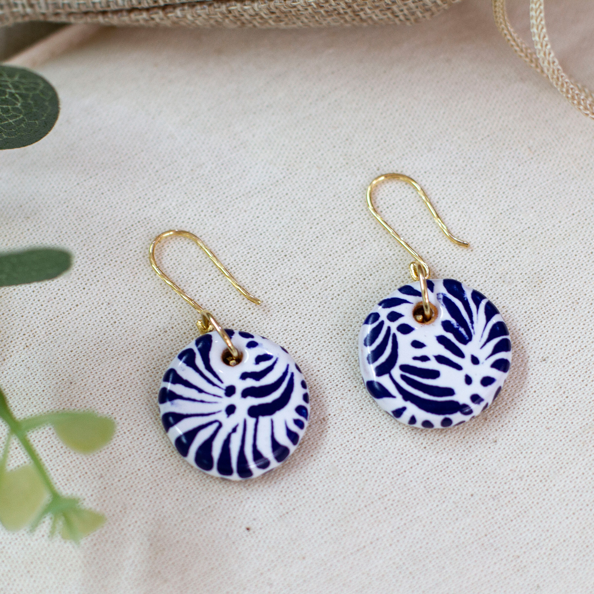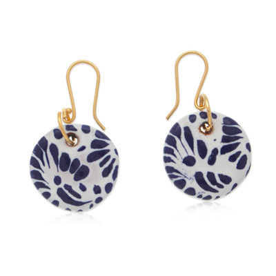 Transform your nights with this Talavera-inspired creation, whose details combine tradition with style. Crafted in Mexico, Monica Vazquez's dangle earrings display lovely round ceramic pendants painted by hand in a palette of blue and white hues. 10k gold-plated brass hooks complete the pair, allowing a look as dazzling as the moonlight.