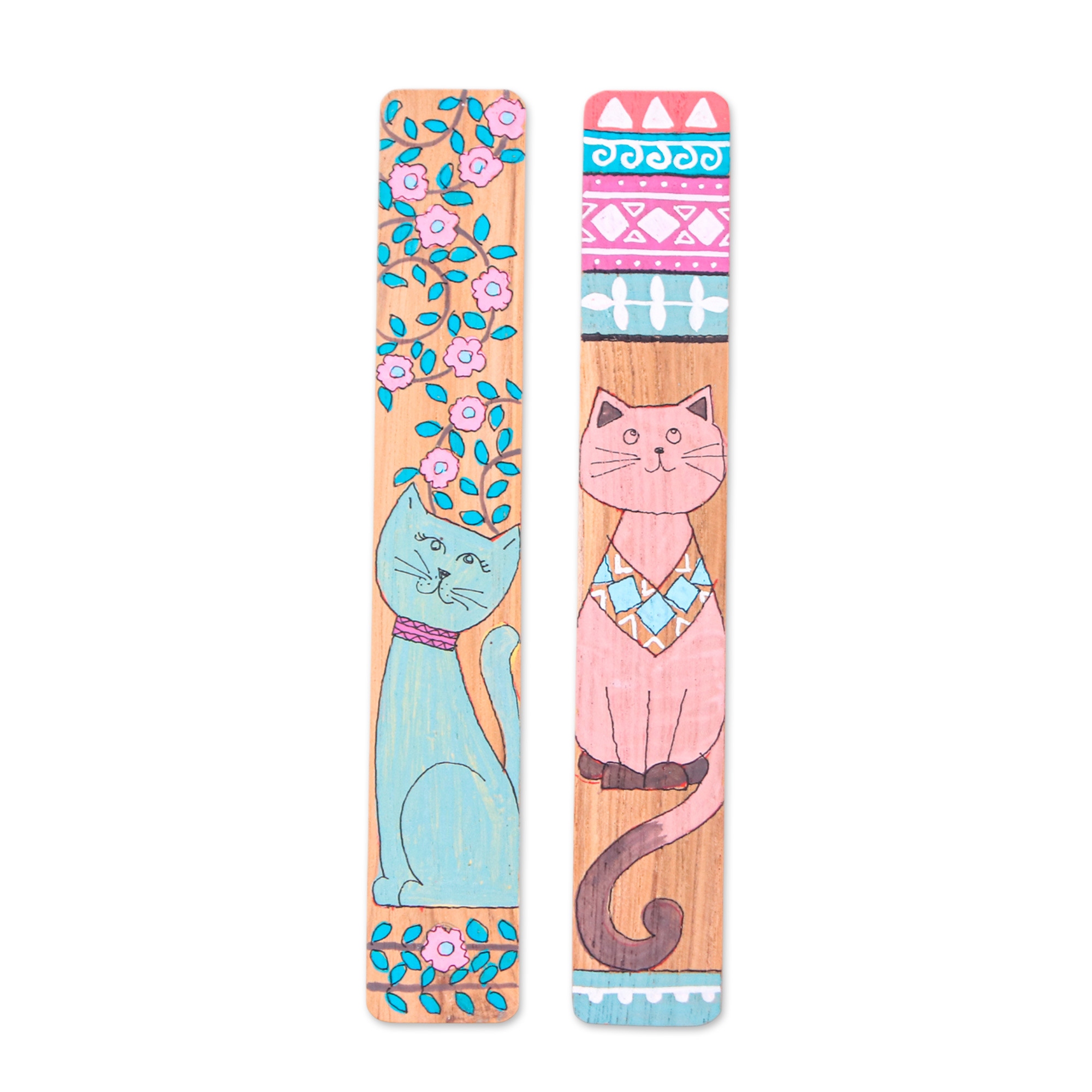 Hand-Painted Cat-Themed 2-Piece Longan Wood Bookmark Set, 'Feline Literature'