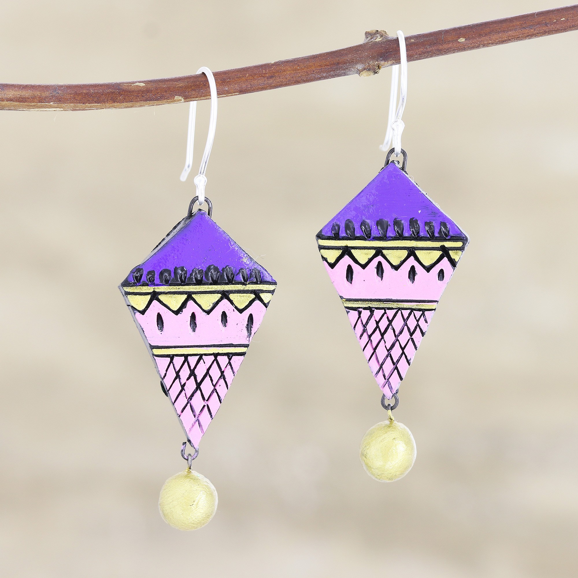 Busy designs march across a pink background in these delightful kite-shaped dangle earrings from Indian artisan Ritu Thapar. Each earring is crafted from oven-fired terracotta, then hand painted in pink, purple, and black. The artisan finishes the earrings with a single gold bauble, glossy lacquer, and gleaming sterling silver hooks.