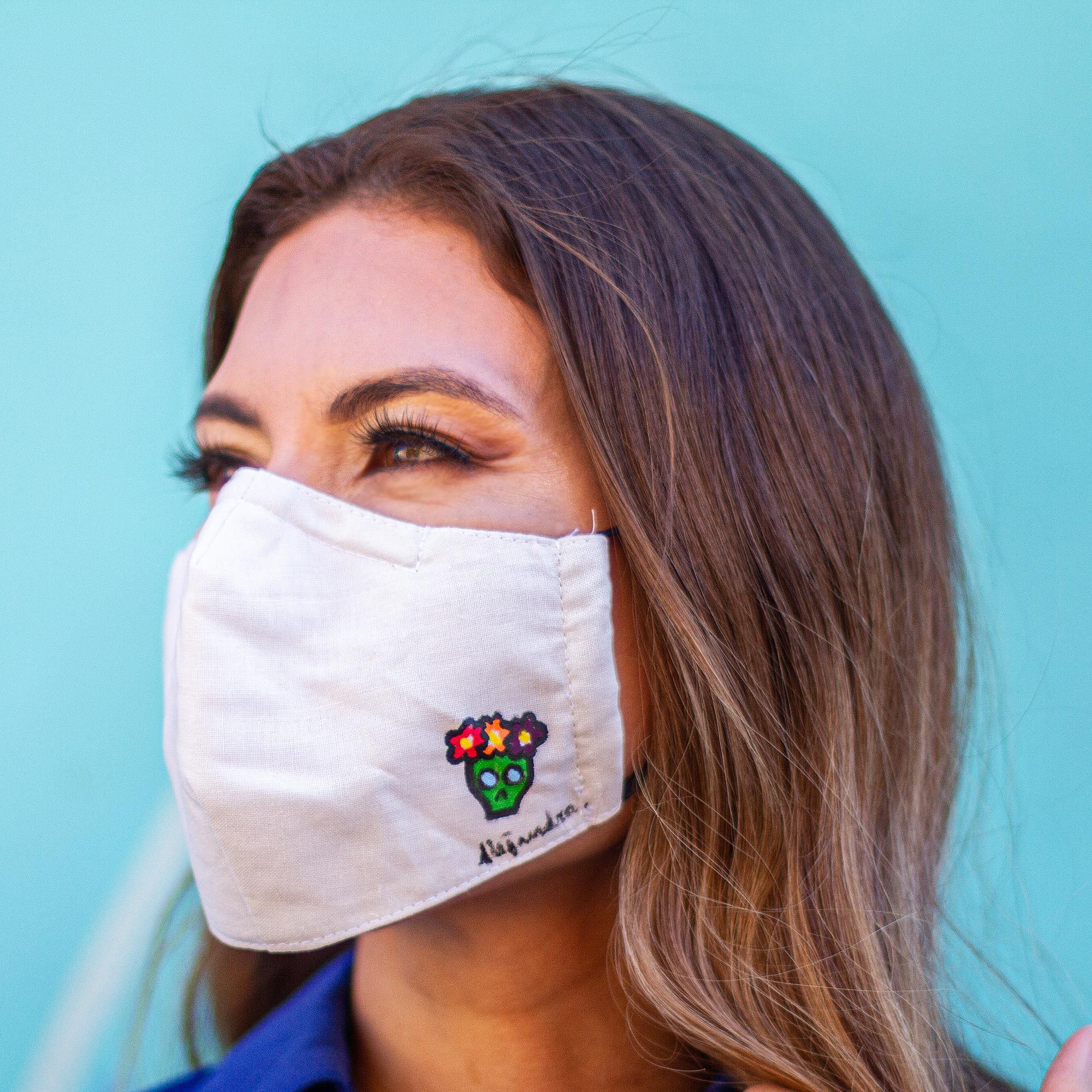 Painted by hand above the artisan's signature, a little green skull is crowned with flowers. It adorns this cotton face mask by Alejandra Aceves. Playful skulls are a beloved image for Mexico's Day of the Dead celebrations. The original contoured triple-layer mask is washable and reusable, with comfortable elastic to loop over the ears.