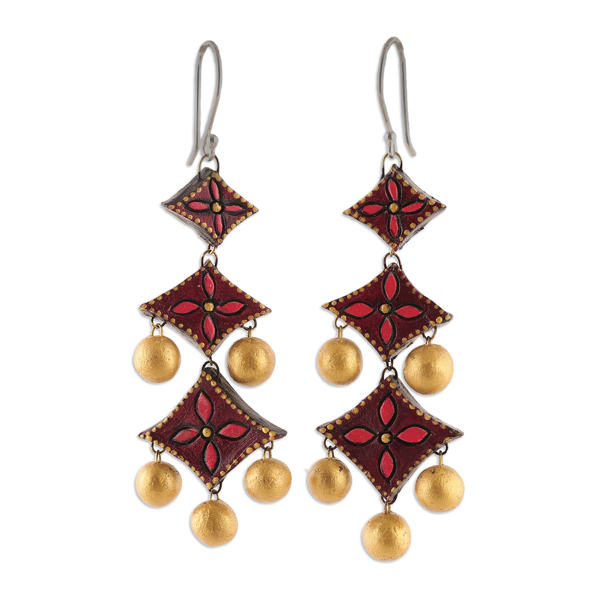 India's floral richness inspires designer Ritu Thapar to create this glamorous pair. Infused with the region's classic elegance, these ceramic chandelier earrings are composed of diamond-shaped pieces, painted with delicate floral details in burgundy hues. Sterling silver hook and golden beads complete the design, exuding an exquisite aura.