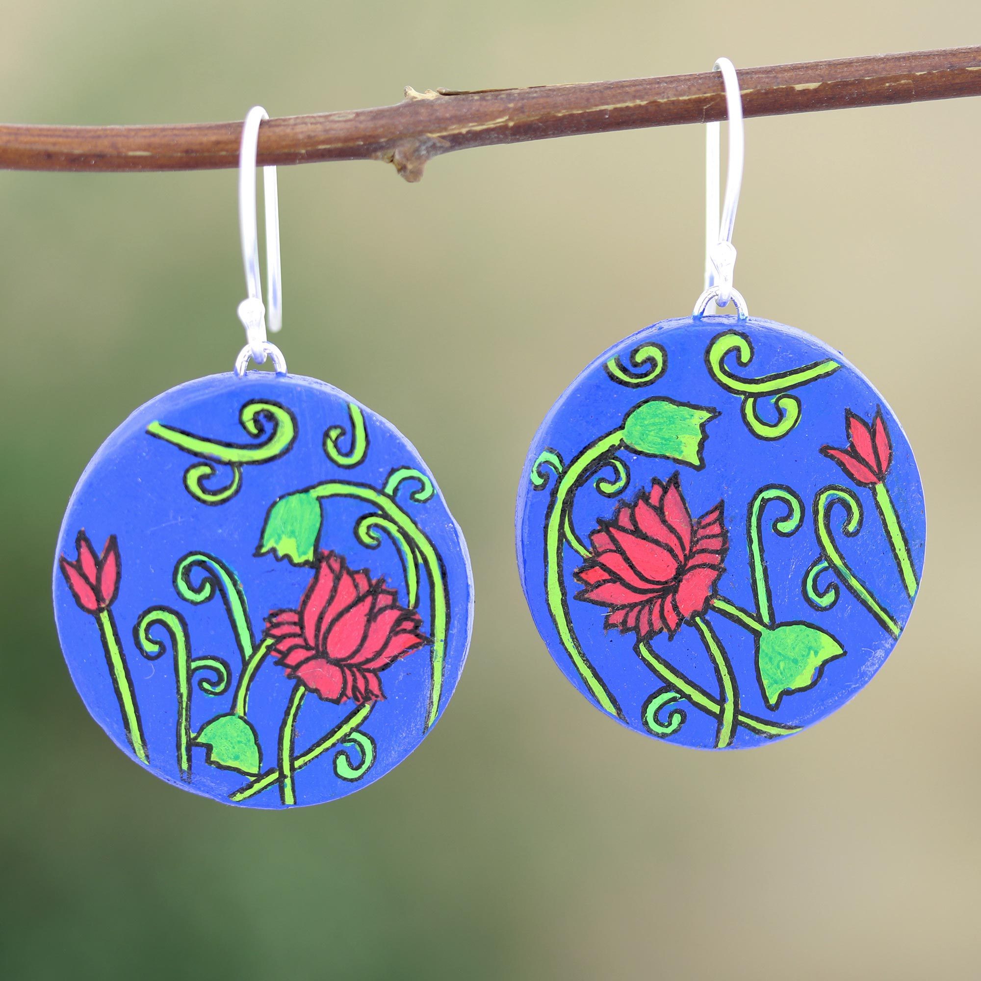 Designed and crafted from oven-fired terracotta, Ritu Thapar's dangle earrings feature a lovely garden motif painted on a bright blue backdrop. Indian artisans craft the earrings from double fired clay before hand painting the surface with glossy lacquer. Polished sterling silver hooks finish the earrings with a touch of luxurious shine.