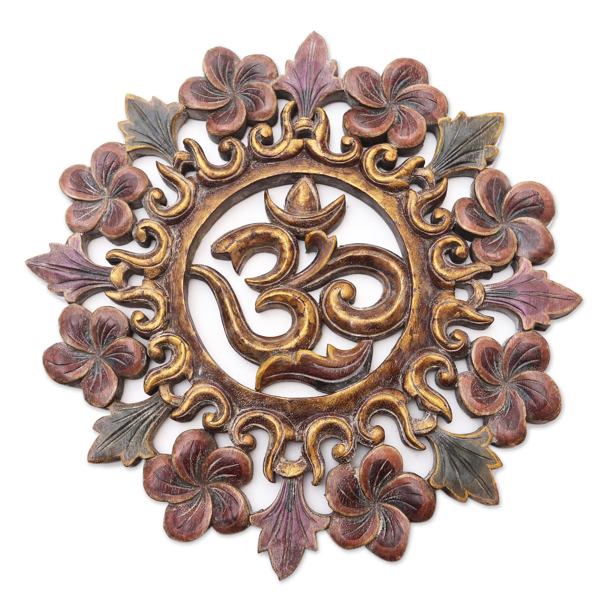 Balinese artisan Ketut Sudantara combines colorful acrylic paint with shimmering gilt to create a unique metallic finish on this floral-themed relief panel. Crafted from local suar wood, the panel features a hand carved ong-kara, or om, symbol at the center. The artisan surrounds the symbol with elegant flowers, then paints the panel in shimmering red and gold.