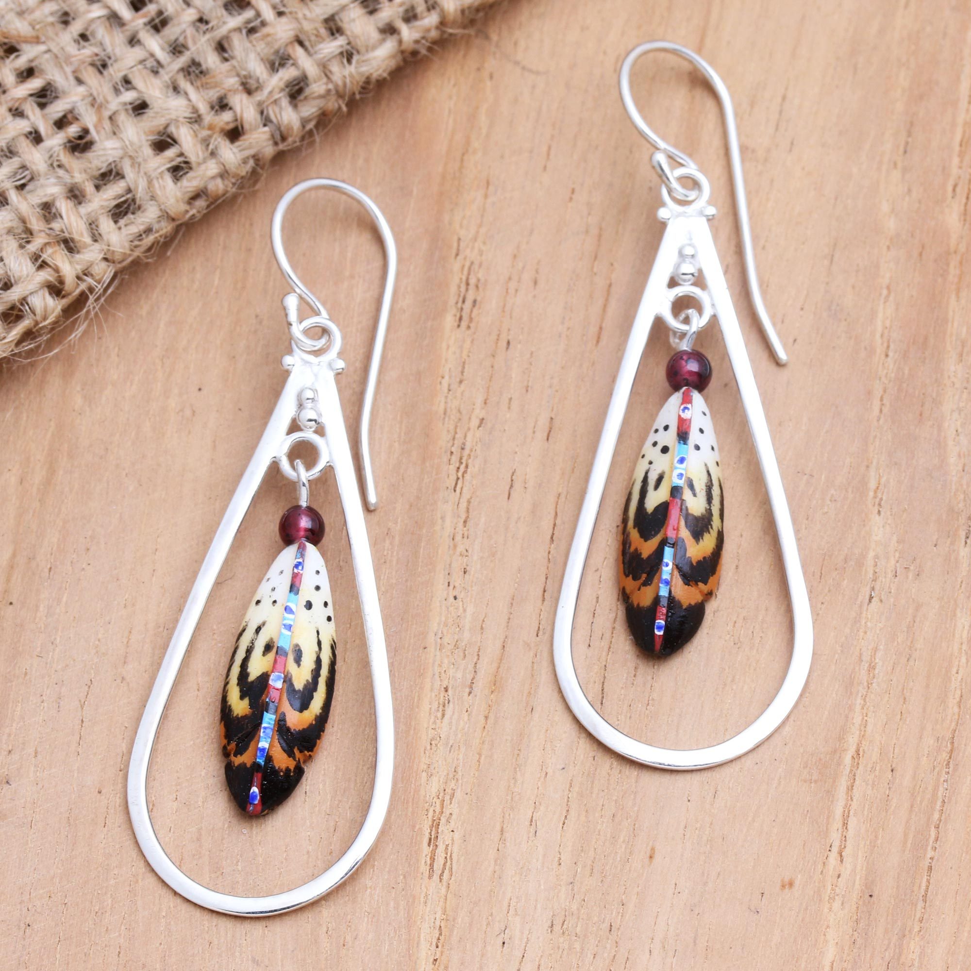 Ayu Ary captures the free-spirited beauty of birds with these pretty dangle earrings, which feature a hand-painted feather motif. The Balinese artisan suspends the "feather"--an oblong piece of natural bone--from sterling silver hooks, where it swings between a sterling silver hoop. Above, a petite garnet beads glows with the gem's signature crimson color.