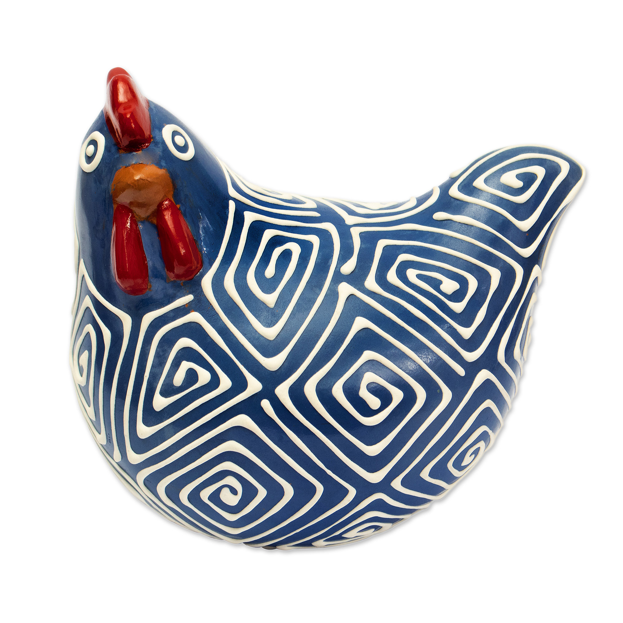 Hand-Painted Geometric Blue Ceramic Hen Sculpture from Peru, 'Avant-Garde Hen'