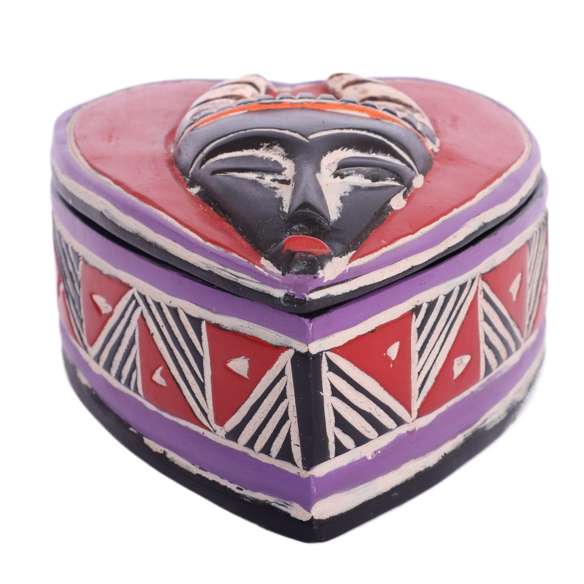 Your cherished treasures find a haven in this extraordinary heart-shaped jewelry box exquisitely painted and carved by hand from sese wood by Ghanaian artisan Victor Ayambire. The element that steals the spotlight is the breathtaking African mask accent adorning the lid, boasting elongated features and a pair of imposing horns.