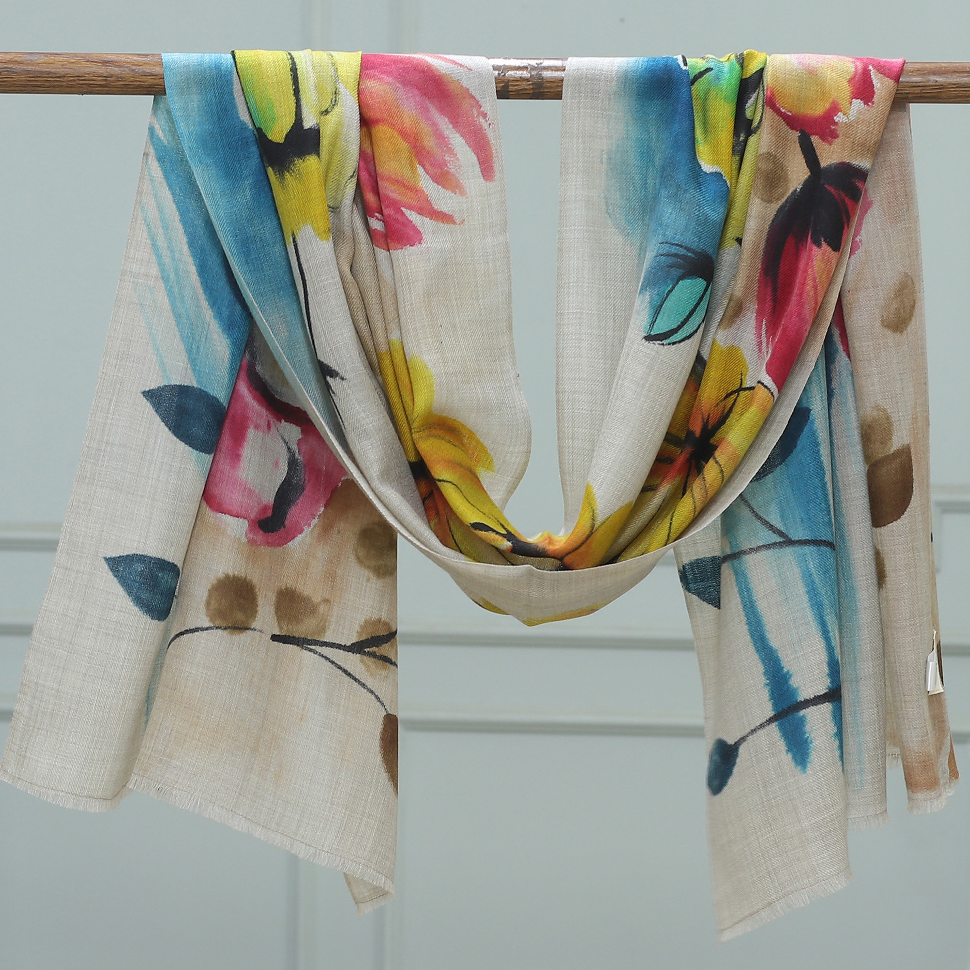 Painted with the true essence of spring, this gorgeous shawl immortalizes a garden of colorful flowers in its soft textiles. Wool and silk threads compose this handwoven shawl, made by Shuja Ahmed in India. Red, blue, and yellow merge in every hand-painted petal, allowing a bright look ideal for several occasions.