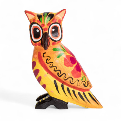 A burst of color meets wild elegance in this hand-carved owl pinewood figurine. Designed by Guatemala's Manuel Delfino, it channels the whimsical artistry of Mexican alebrijes, its surface alive with bright floral and leaf motifs. Every curve and hue celebrates one of nature's most captivating creatures in a way that feels bold yet timeless.