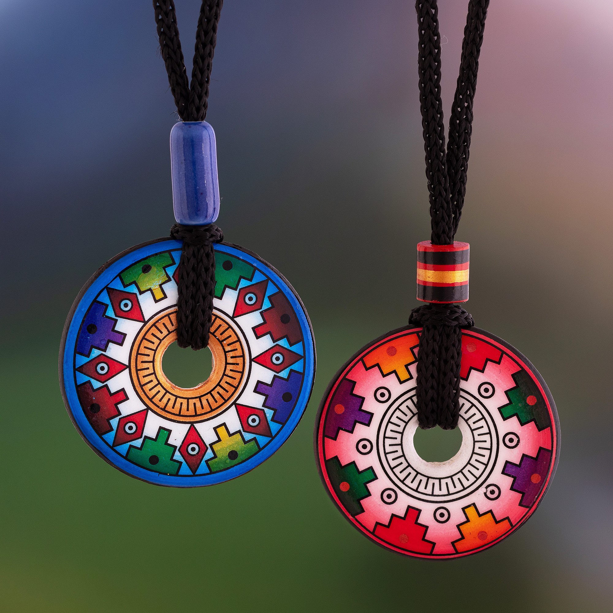 Inca culture serves as the basis for the design of this pair of ceramic pendant necklaces from Peruvian artisan Dina. One pendant has a pink and white background and the other a blue and white backdrop; each is filled with symbols and shapes that recall the geometric motifs found on ancient artifacts. Hand painted in various vivid hues, the pendants hang from black nylon cord and are crowned with blue and red beads.