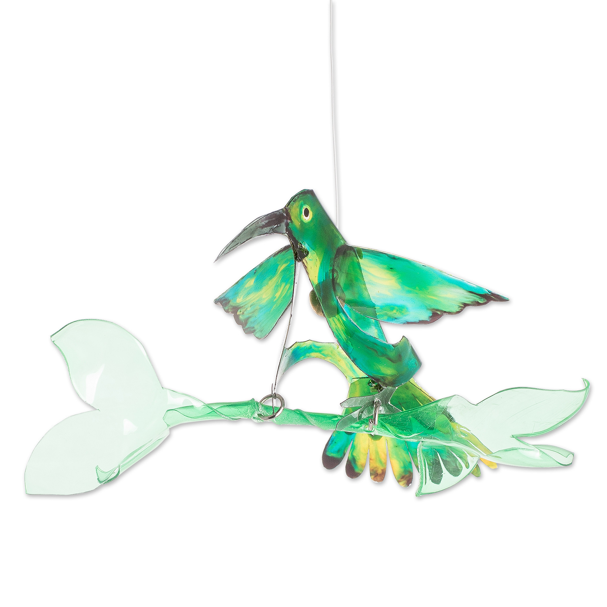 Hand-Painted Recycled Plastic Mobile of a Green Hummingbird, 'Magical Fauna'