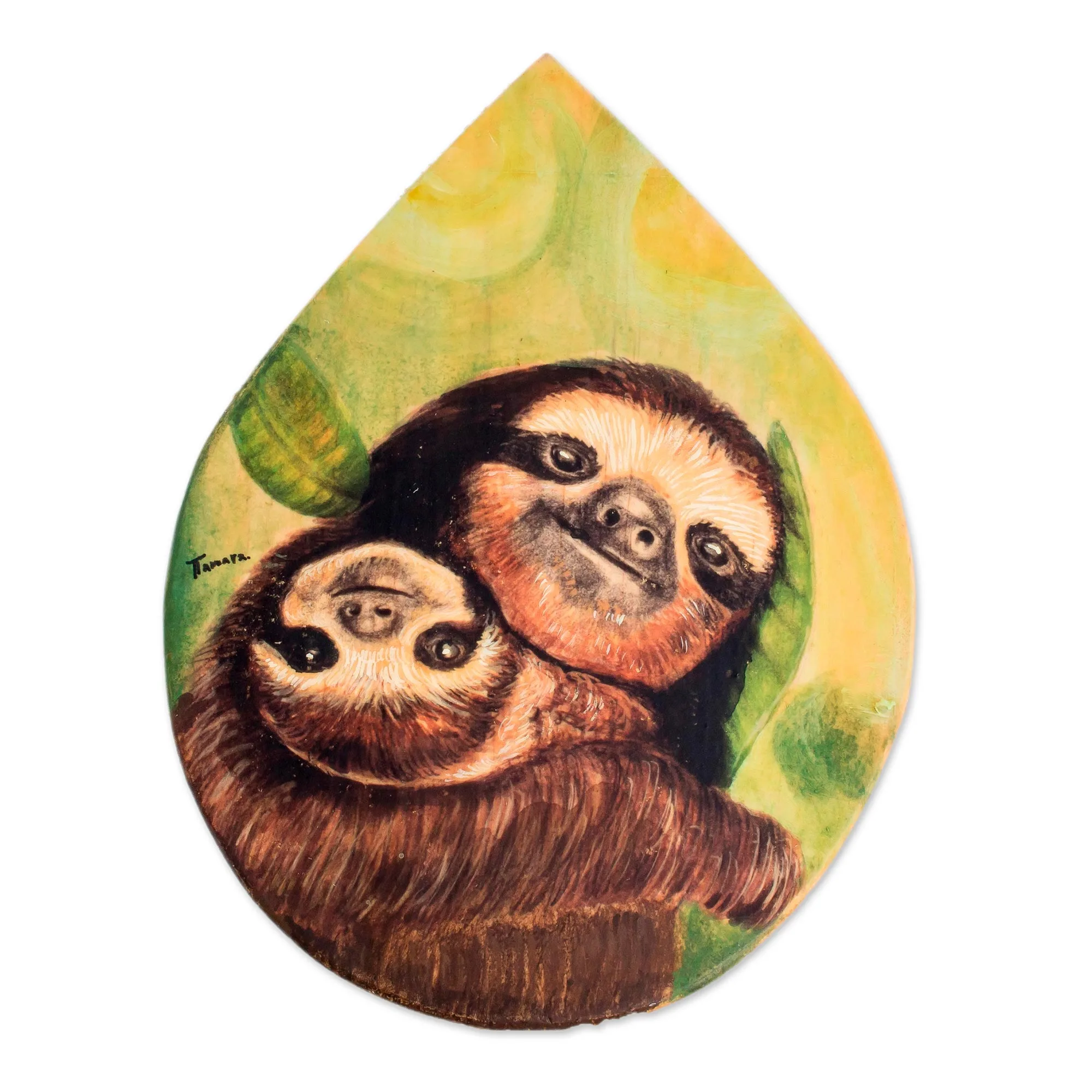 Crafted of pinewood, this drop-shaped plaque is the work of Costa Rican artisan Tamara Rojas. She hand-paints the image of a mother sloth as she holds her baby.
