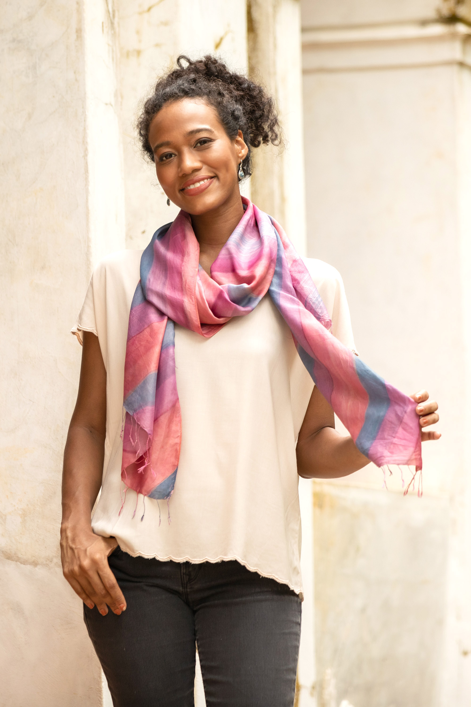 The Nutcharath family in Thailand adapts the flowing water motif on their brightly colored shawl from the Thai Lue weaving pattern. The artisans craft the shawl from 100% silk before hand painting the fabric with undulating stripes in natural, candy-colored dyes.