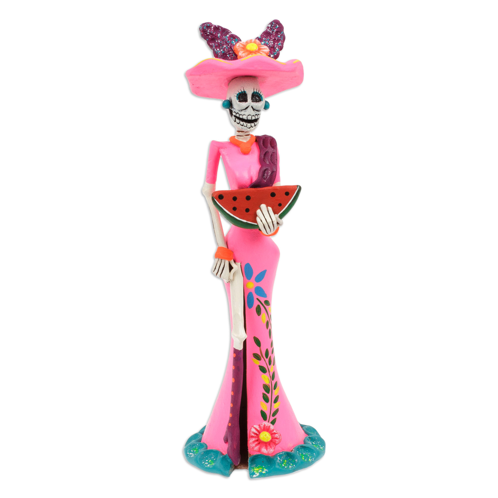 Lady Catrina is ready to enjoy the Day of the Dead and the summer season with a sublime pink dress adorned with floral details, all crafted and painted by master artisan Jorge Escamilla from Mexico. Inspired by the joyous days in the region, the artisan uses ceramic to craft this charming sculpture that portrays this graceful lady on a sunny day, eating a watermelon piece.