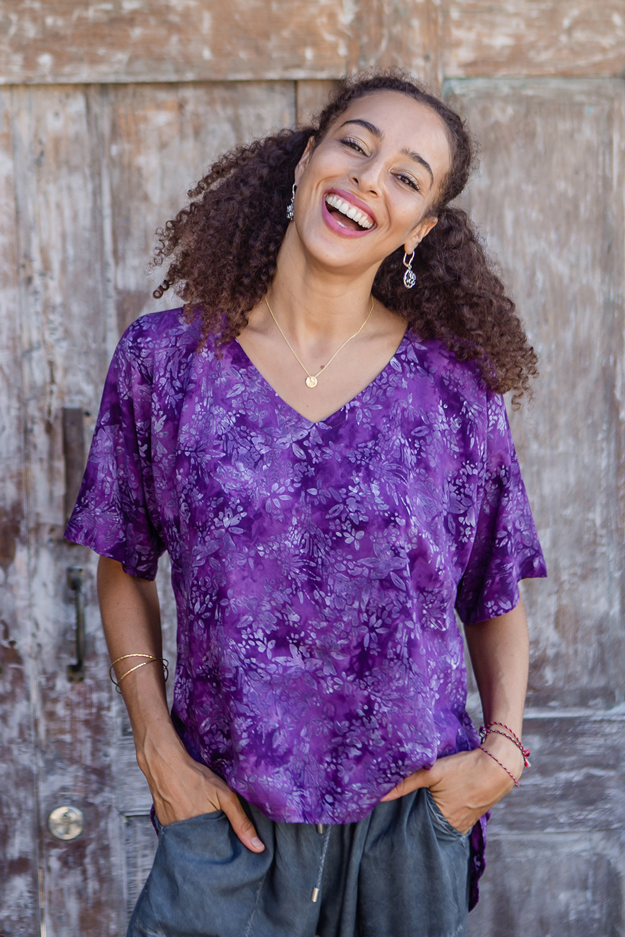 Designed in shimmering amethyst purple, Galuh Kenanga's beautiful blouse is covered in lily flowers. Hand crafted by Balinese artisans with soda ash--a dyeing technique that creates radiant color--the rayon blouse features a hand-stamped batik print and an elegant high-low hem.