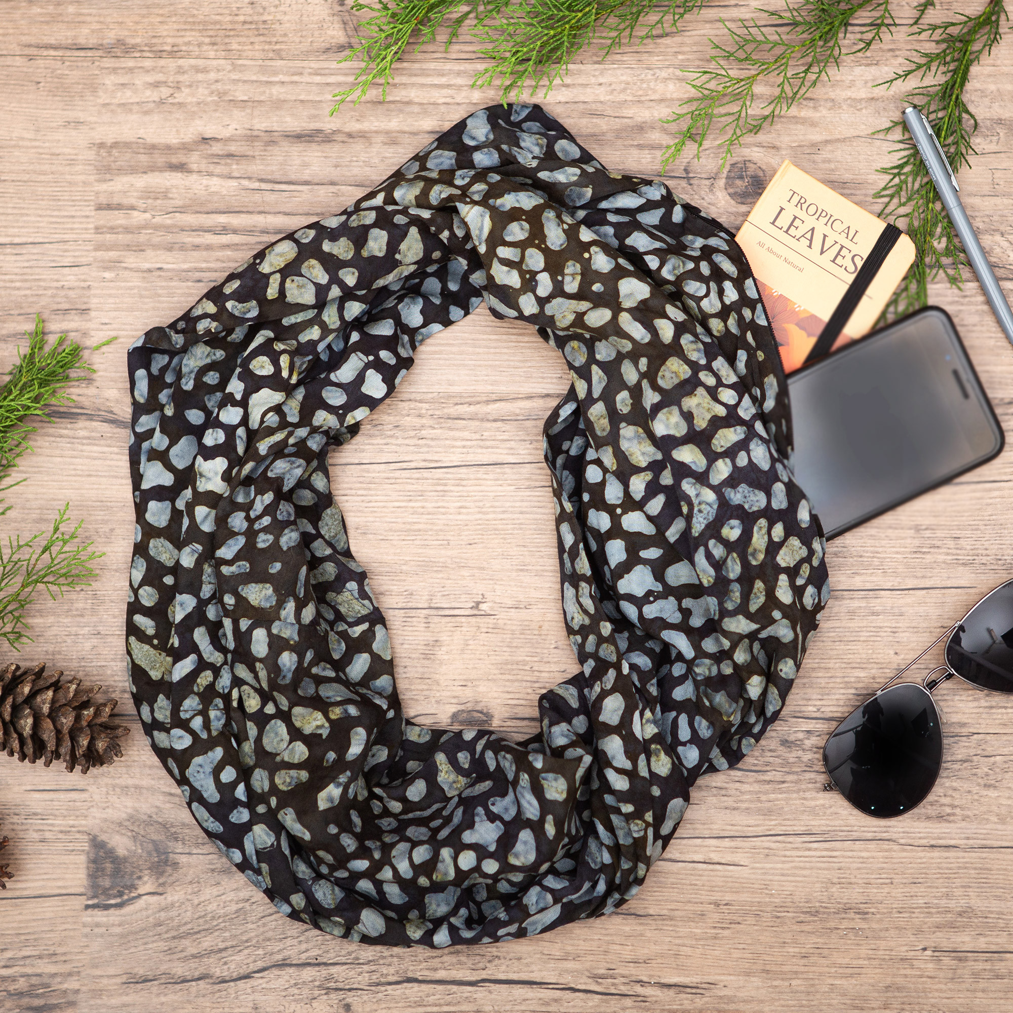 Perfect for travel, Balinese artisan Saktut Raitawati's batik infinity scarf includes a zippered pocket for stashing your ID or passport. Crafted from rayon, the scarf features a hand-stamped pebble motif in light grey on a coal black base.