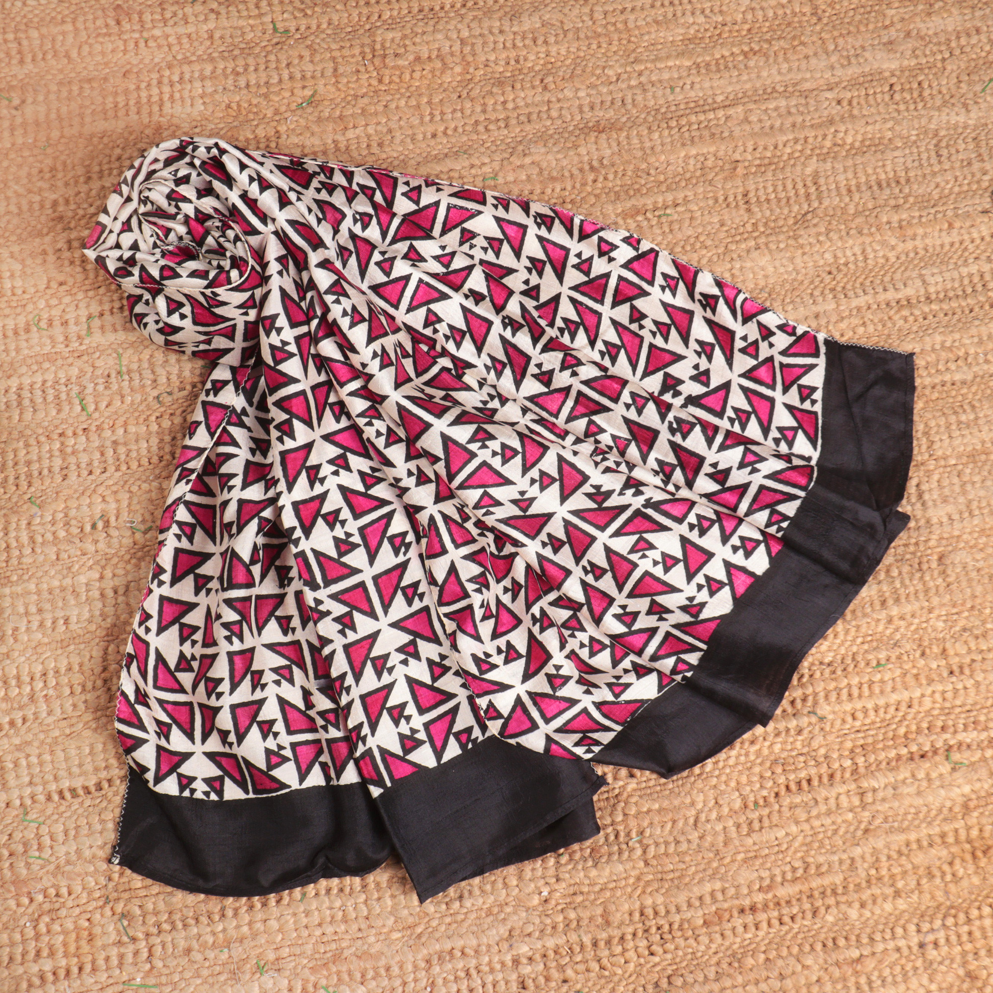 Vibrant fuchsia and blue triangles create a captivating rhythm across ivory silk in this handwoven shawl that proves geometry can be glamorous. India's Rajnandinee and Srabonti bring traditional hand block-printing into the contemporary realm with crisp angular motifs that command attention through bold color and sharp design. The lightweight silk drapes with effortless grace over any outfit, transforming casual weekend looks and evening ensembles alike with its modern geometric energy and luxurious texture.