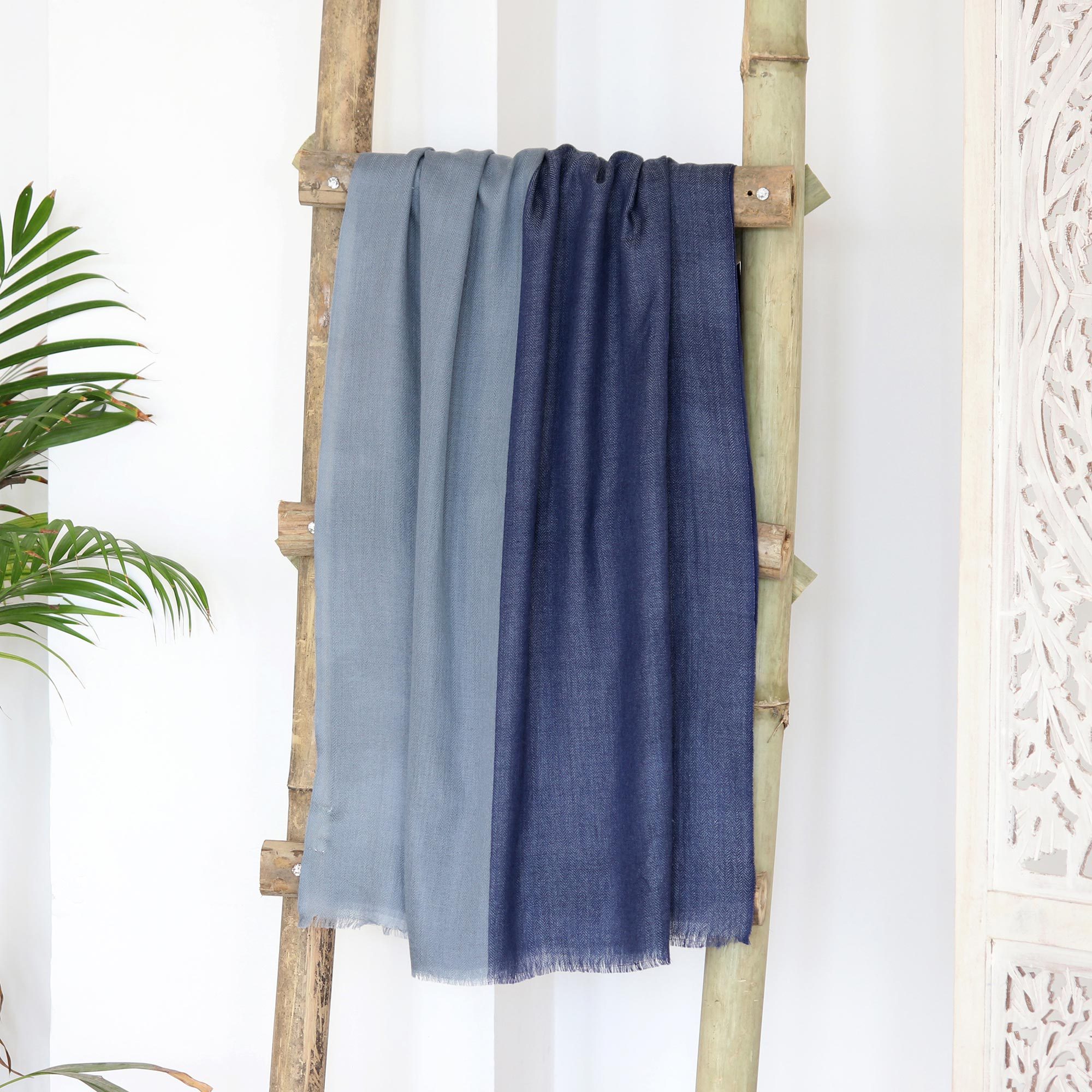 Composed entirely from two beautiful shades of blue, Indian artisan Sajad's woolen shawl vibrates with color. Hand-woven on a traditional handloom, the shawl features a graphic color-block motif in cool azure and rich navy blue.