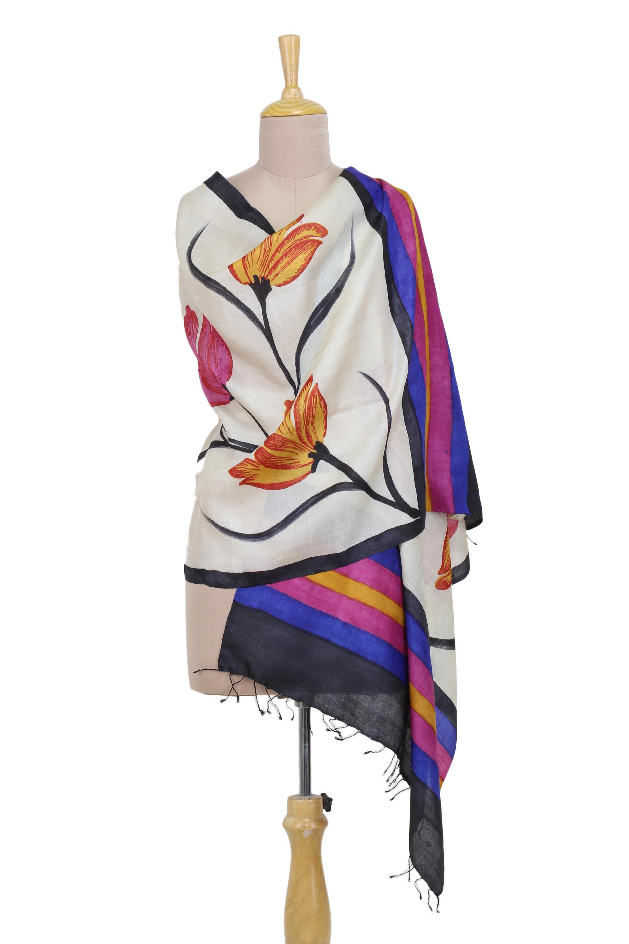 Accented with stripes of sapphire, magenta, amber, and black, this beautiful shawl from India features block-printed floral motifs in amber and magenta that climb across a body of ecru. Rajnandinee and Srabonti design the shawl, weaving it by hand of Tussar silk and finishing it with delicate fringes on the ends.