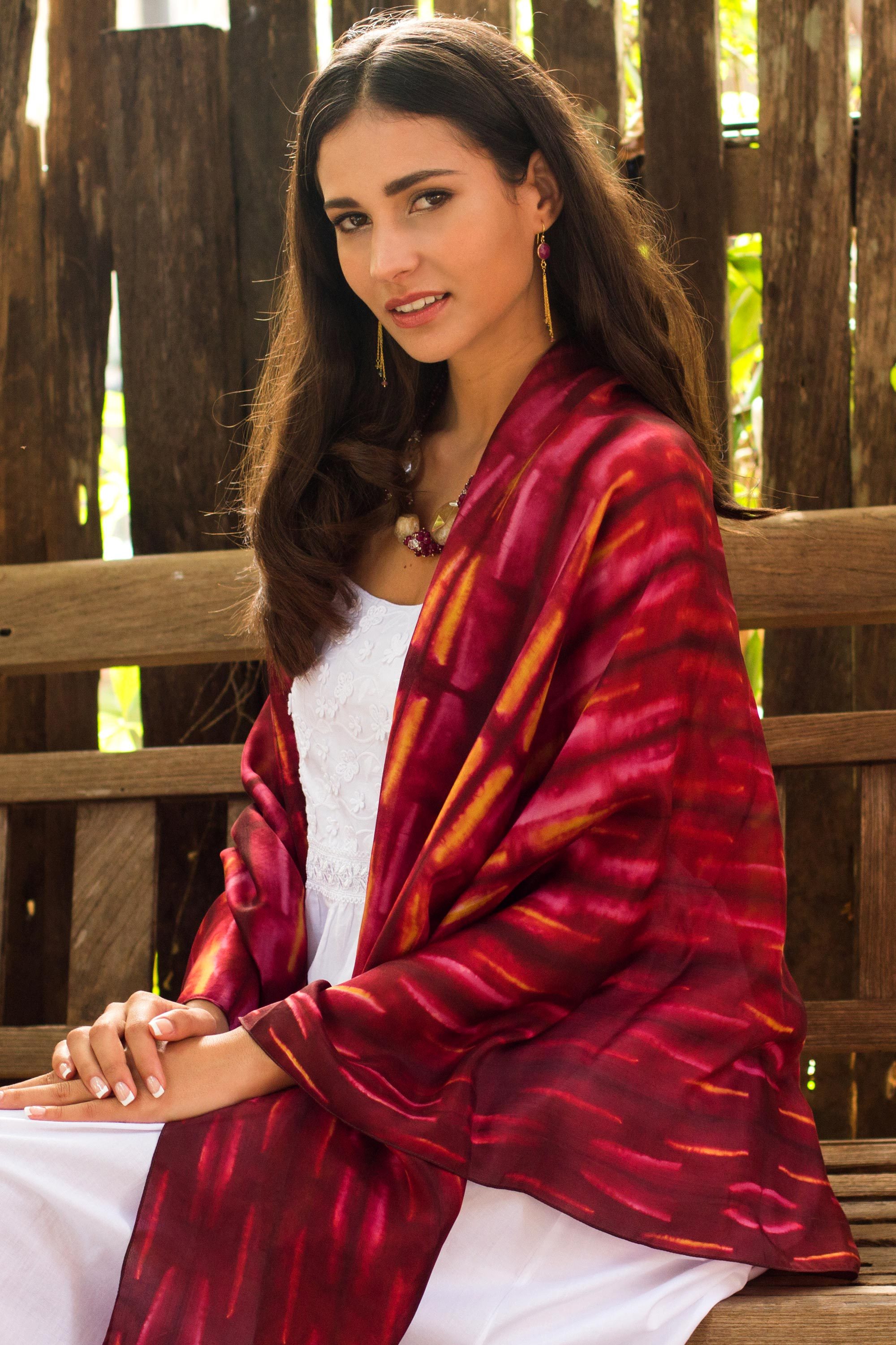 Hand Woven Red Pink and Yellow Tie Dyed Silk Shawl, 'Mekong River'