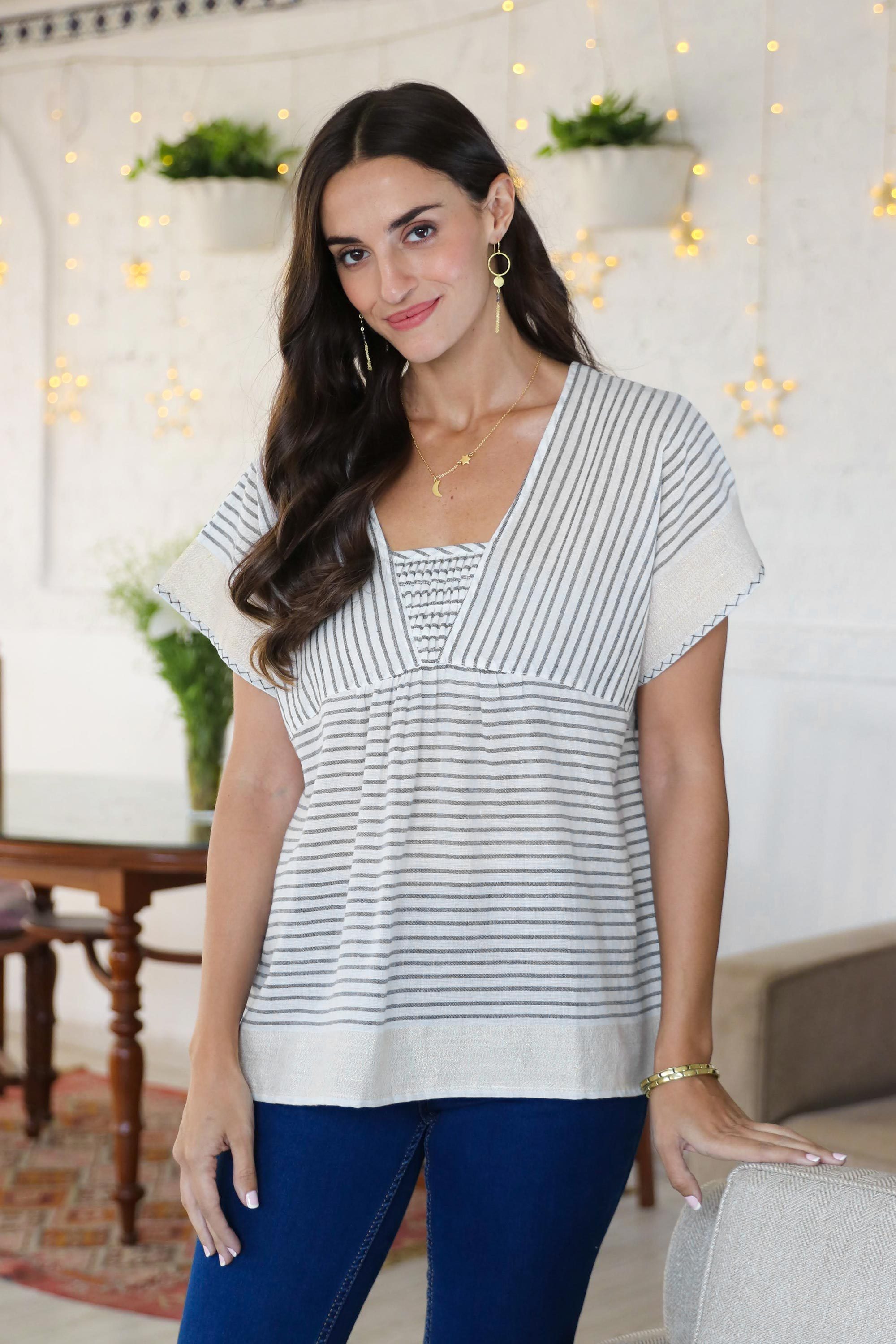 Horizontal and vertical stripes pack a visual punch on this breezy blouse from India's Jay Kumar Maheswari. Crafted from 100% cotton, the hand-woven blouse features a v-neckline, short sleeves, and loose, comfortable fit. The semi-sheer blouse is lined with white cotton and beautifully accented with golden Lurex on the sleeve and bottom hemlines. A hand-embroidered zigzag pattern along the cuffs finishes the blouse in style.